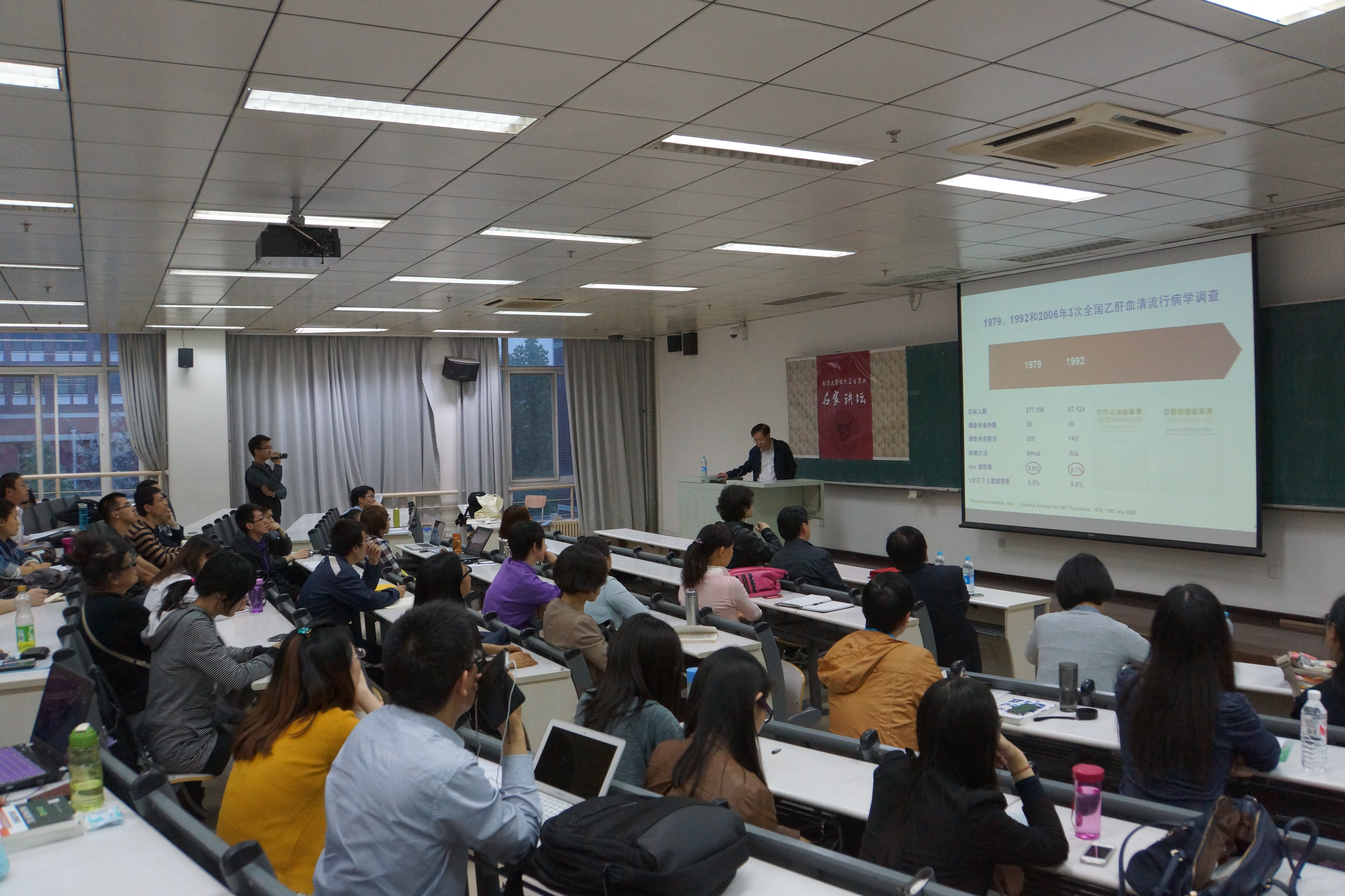 2014年4月28日晚7时,由公共卫生学院举办的系列讲座“北京大学公共卫生名家讲坛”在逸夫教学楼408教室举行,中国工程院院士、世界卫生组织西太区消灭脊髓灰质炎证实委员会委员、世界卫生组织西太区控制乙型肝炎专家组成员、世界肝炎联盟公共卫生学专家、亚太地区消灭病毒性肝炎联盟委员、国家药典委员会委员、中华预防医学会副会长、中华医学会理事、中华医学会肝病学会名誉主任委员、北京大学基础医学院病原微生物系庄辉教授作为主讲嘉宾,来自公共卫生学院及医学部内外的本科生、研究生、青年教师六十余人到场聆听了讲座。讲座由公共卫生学院院长孟庆跃教授主持。