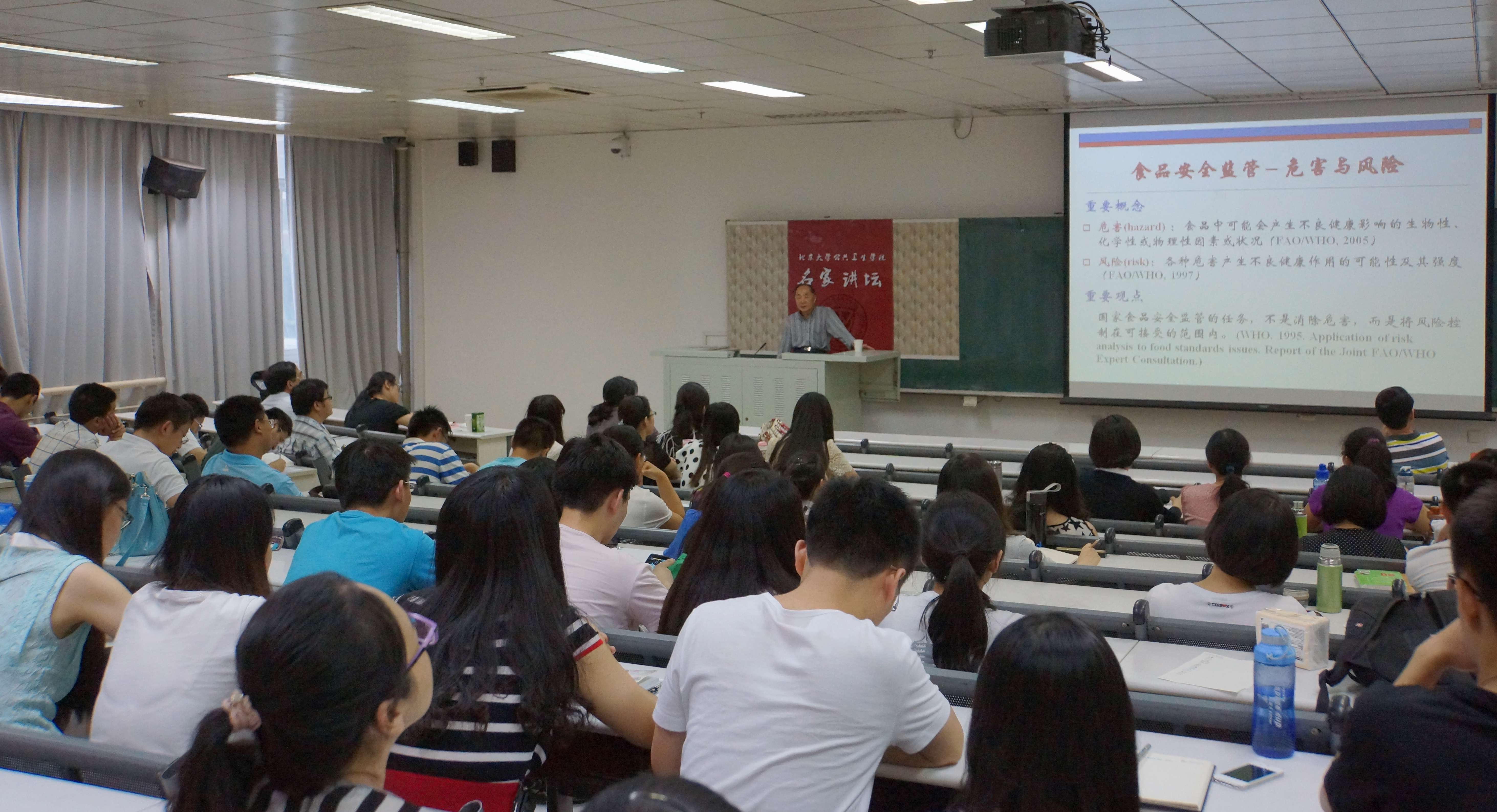 2014年5月26日晚7时,由公共卫生学院举办的系列讲座“北京大学公共卫生名家讲坛”在逸夫教学楼408教室举行,中国工程院院士、现任国家食品安全风险评估中心总顾问、国家食品安全风险评估专家委员会主任委员、国家食品安全标准审评委员会副主任委员、国际食品添加剂法典委员会主席、世界卫生组织食品安全专家团成员、国际生命学会中国办事处主任、美国康奈尔大学营养科学系和香港中文大学兼任教授、中国毒理学会名誉理事长陈君石教授作为主讲嘉宾,来自公共卫生学院及医学部内外的本科生、研究生、青年教师近百人到场聆听了讲座。讲座由公共卫生学院党委书记郝卫东教授主持。