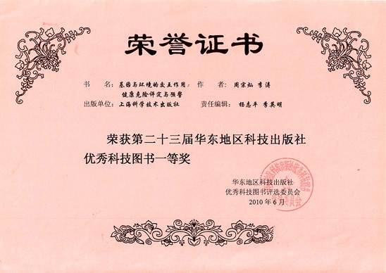 公共卫生学院毒理学系周宗灿教授等主编的专著《基因与环境的交互作用:健康危险评定与预警》获第二十三届华东地区科技出版社优秀科技图书一等奖