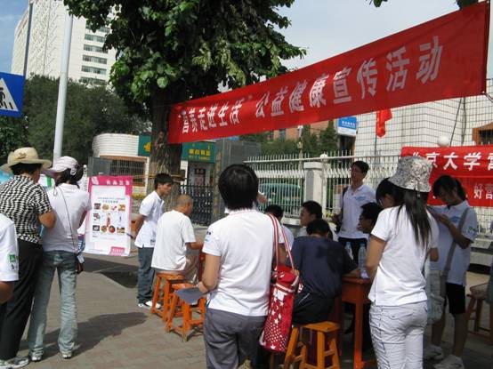 此次活动是由北京大学公共卫生学院营养与食品卫生学系主办,内蒙古医学院卫生事业管理学系协办。活动地点分别在呼和浩特市新华广场周边和重点社区。活动现场气氛浓厚,悬挂的宣传标语和实践旗帜迎风飘扬,吸引到许多市民前来参加。两校的师生们精神饱满,耐心地向前来咨询的市民解答营养和健康的疑问,为在场的市民提供了专业且富有可行性的建议。同时免费发放自行设计的“膳食平衡”和“乳制品安全”的宣传手册,并收集到热心市民填写的关于食品安全知识的问卷。