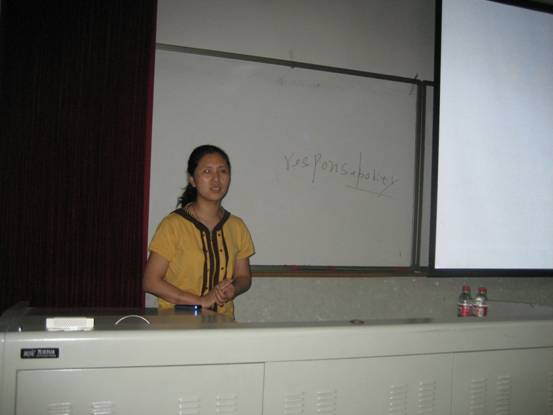 佟颖副所长则为大家详细的介绍了各种消毒方法及其特点和适用范围,讲解了震后防病的各种方法及注意事项,并着重介绍了消毒工作人员的自身防护,从操作层面给予了详尽的指导。最后佟所长回答了同学们提问提出的去灾区自愿服务应作哪些准备及注意事项等问题做了认真详细的回答。