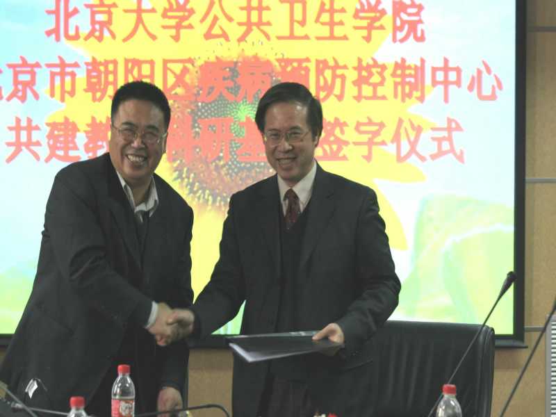 签字仪式由朝阳区卫生局副局长师伟主持,他在介绍双方来宾后讲到特别感谢北大公卫学院一直以来的支持与帮助,特别是在SARS期间派流行病学专家曹卫华教授来帮助工作。在最艰难的时刻曹教授始终与他们坚持在一线做了很多工作,调查、建议、培训等,圆满完成任务,得到上级好评。胡永华院长发言中首先感谢朝阳区疾病预防控制中心一直以来对学院的支持,双方在科研、教学方面有很好的合作,已经有学生在这儿实习。随后他介绍了公共卫生学院情况,并希望加强科研合作与学术交流。