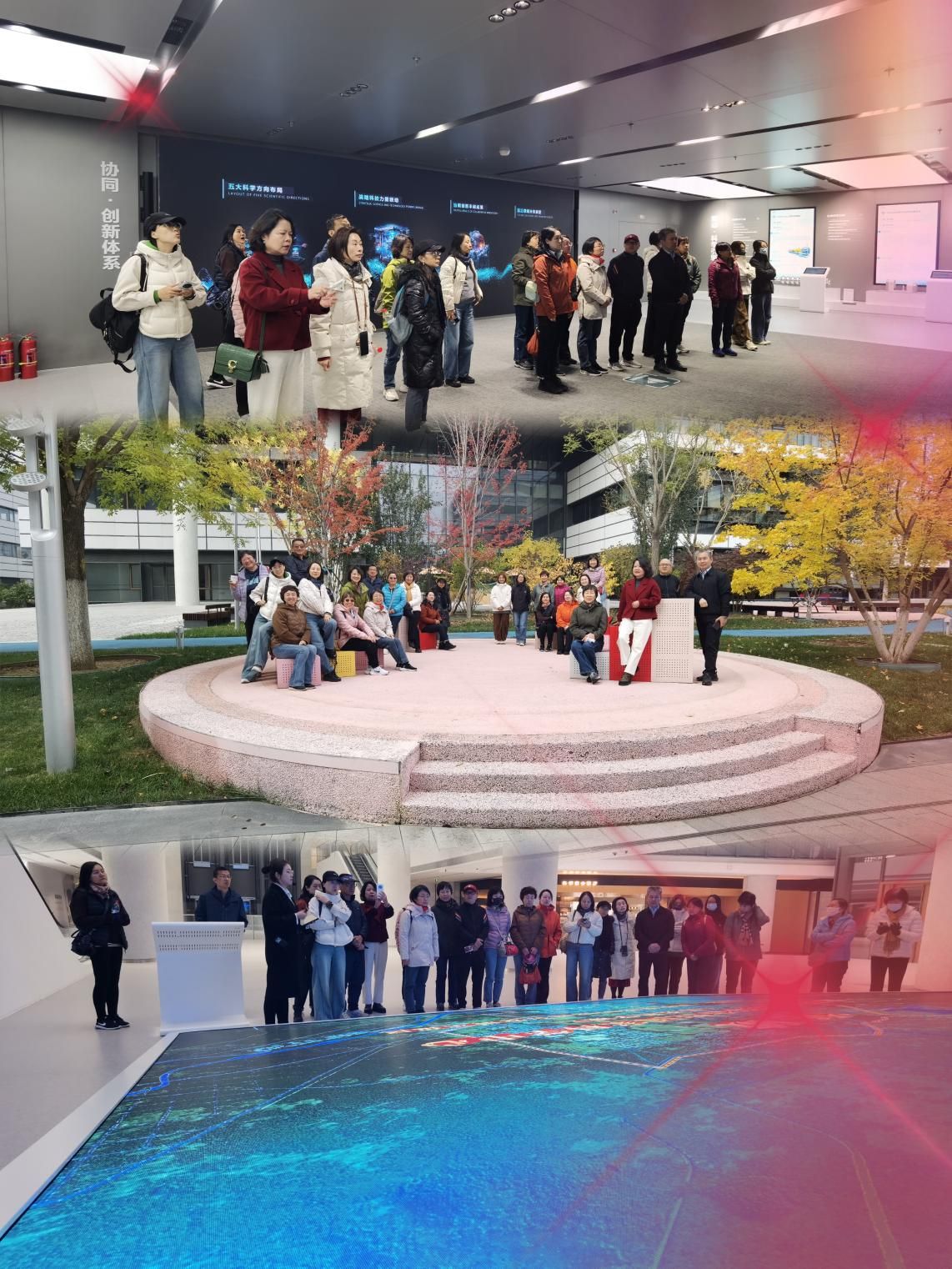 走出怀密医学中心建设施工现场,赴初具规模的怀柔科学城。在怀柔科学城管理委员会办公室的悉心安排下,在有限时间中精选出怀柔科学城新质生产力创新中心、城市客厅作为主要参观点位。在科学城讲解员导引讲解下,通过现场踏勘、展板介绍、全息影像等多种方式,展现怀柔科学城在国家发展、首都发展中的战略定位,令教职工了解怀柔科学城的布局谋篇及其未来发展走向;增强教职工对于国家发展顶层设计的理解和支持,增加教职工对于未来工作生活所处的这处新城的了解和信心,提升教职工对于未来美好发展蓝图擘画的底气和勇气。