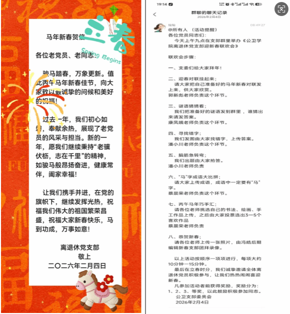 离退休党支部作为联系学院离退休党员的基层组织,在支委会的带领下,秉承“服务离退休干部,传递党的温暖”的宗旨,通过开展丰富多样的活动团结离退休党员,增强支部的凝聚力和战斗力,在2026年春节来临之际,党支部向全体党员送去新春的问候,并于2月4日在线上开展了新春联欢会。