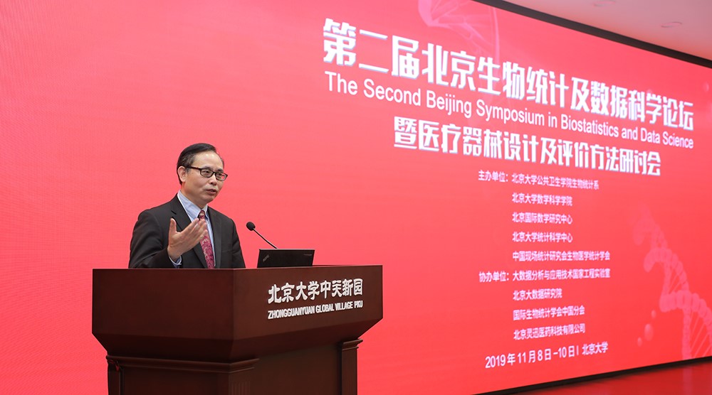 11月8日到10日,“第二届北京生物统计及数据科学论坛” 在北京大学成功举办。本次论坛以“医疗器械设计及评价方法”为主题,结合生物统计和数据科学最新的研究进展,从多个角度进行了深入研讨。论坛由北京大学公共卫生学院生物统计系、北京大学数学科学学院、北京国际数学研究中心、北京大学统计科学中心、中国现场统计研究会生物医学统计学会联合主办,大数据分析与应用技术国家工程实验室、北京大数据研究院、国际生物统计学会中国分会、北京灵迅医药科技有限公司协办。来自政府监管部门及有关机构权威人士,学术界,企业界等300余名专家学者出席。北京大学副校长,北京国际数学研究中心主任,中国科学院院士田刚,北京大学医学部副主任肖渊,北京大学公共卫生学院生物统计系系主任、北京大学博雅讲席教授周晓华分别在开幕式致辞。