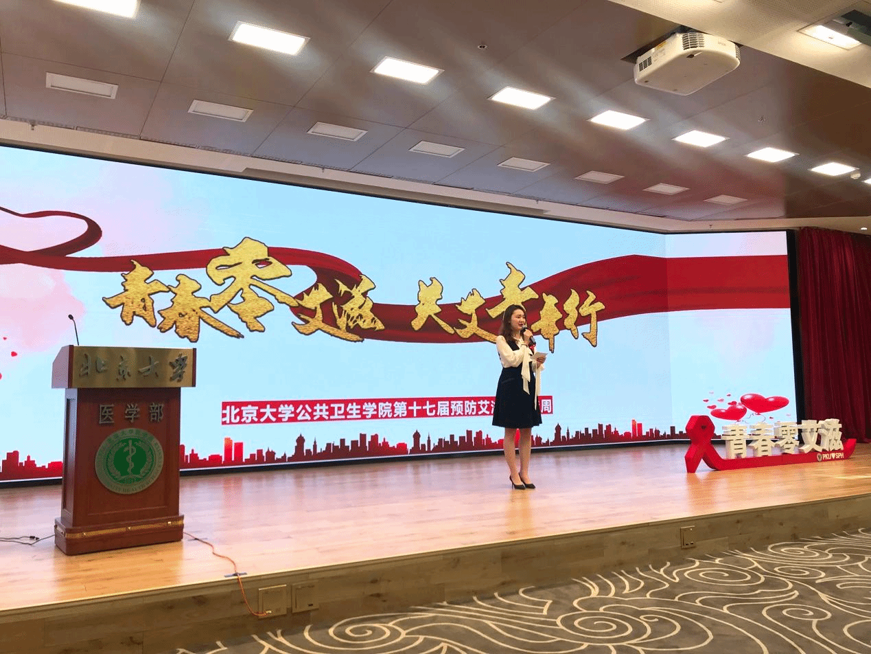 北京大学公共卫生学院学生会主席王雨竹同学,代表全体公卫学子在启动仪式上进行发言。她提到预防艾滋病宣传周是北大公卫学院的品牌活动,在祖国日新月异的今天,作为一名北大公卫人生逢其时、重任在肩,新时代的北大公卫青年学子一定不负使命,在防艾的道路上继续前行。