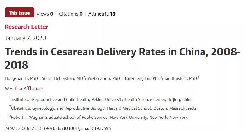 2020年1月7日国际知名医学期刊《JAMA》发表北京大学公共卫生学院刘建蒙团队研究成果,题为“Trends in Cesarean Delivery Rates in China, 2008-2018” (Research Letter)。
