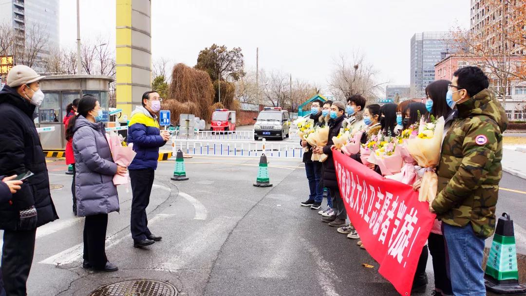 北大公卫研究生志愿者团队的支援工作受到了医学部和学院领导的高度重视,在支援疫情相关工作期间,北京大学医学部党委副书记徐善东、公共卫生学院院长孟庆跃、党委书记郝卫东等院领导分别前往慰问志愿者们。2月14日下午4时,志愿者团队顺利抵达医学部,等候在校门口的学工部及学院领导和老师们向志愿者师生献上鲜花,学工部还为每位志愿者配备了口罩,他们对志愿者们的辛勤工作和无私奉献表示高度赞赏,嘱咐大家回来一定好好休整,并鼓励大家总结在实战中学习的知识和经验,为今后的学习、研究和工作提供参考;也号召志愿者们,作为广大公卫学子的榜样,要及时与同学们分享参与疫情防控工作的感想与体会,让公卫人勇担重任、无私无畏的精神传承接力。