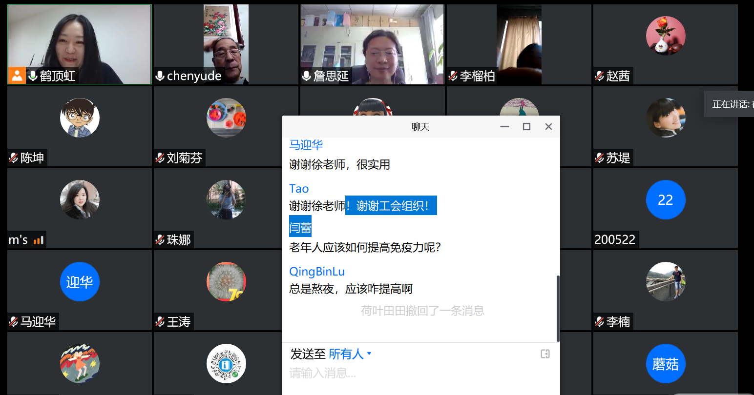 2020年春,新冠病毒(COVID-19)疫情的爆发、蔓延,正在全世界肆虐,给人类的健康、社会的发展带来了极大的挑战。免疫系统作为人类的健康门户,在和病原体作斗争的过程中,发挥着至关重要的作用。徐美虹老师首先带领大家回顾了免疫系统的基本组成,并讲解了机体获得的各项营养元素在免疫系统中发挥的重要作用,通过实例,讲解了人类每日膳食各大营养素的基本摄入量,对一些热点问题,譬如“早餐不该喝粥?”、“少吃主食,是否会对机体免疫力产生影响”等,给出了科学的解释和回答。针对疫情严控期,由于条件受限造成的食品多样化降低、运动量减少导致的身体机能下降等情况,徐老师也给出了科学的建议,得到了老师们的一致好评。目前新冠疫情进入了防控常态化“后疫情”时代,徐老师建议避免聚集用餐、保持距离,分餐制,用“公筷公勺”也得到了在线老师的一致认可。讲座的最后,在线的老师们积极提问,气氛热烈;在詹思延老师简短总结后,讲座落下帷幕。