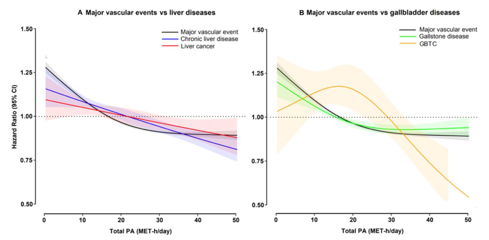 图:体力活动与肝胆疾病和主要心血管事件发病风险的关联