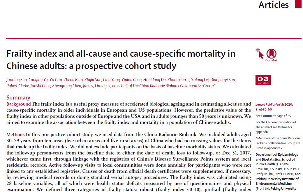 2020年12月1日,北京大学公共卫生学院李立明和吕筠教授团队在《柳叶刀-公共卫生》杂志发表了关于中国中老年人群衰弱指数与全因死亡和死因别死亡风险的最新研究,研究提示了在中老年人群中利用衰弱指数这种简单的代理指标开展风险评估、指导预防的价值。