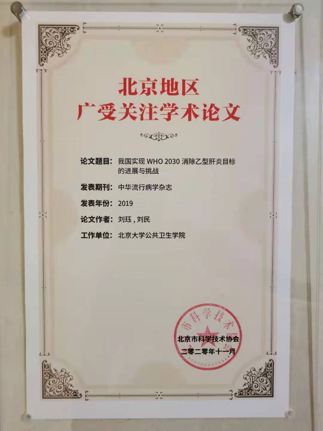 刘民教授、刘珏副研究员团队“北京地区广受关注学术论文”证书