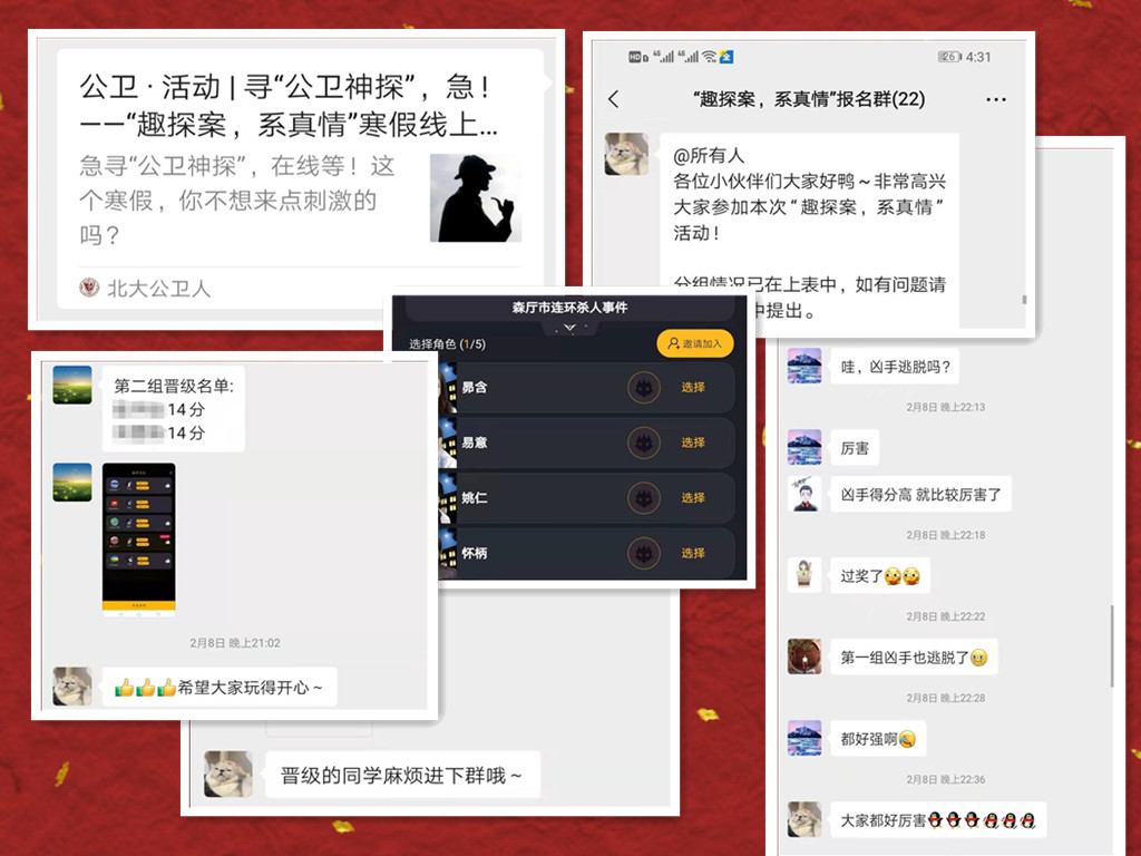 学院还组织了“趣探案,系真情”线上活动,让同学们在探寻蛛丝马迹,展开头脑风暴的同时,舒缓一学期学习生活的紧张情绪,增进同窗了解,维系深厚情谊。