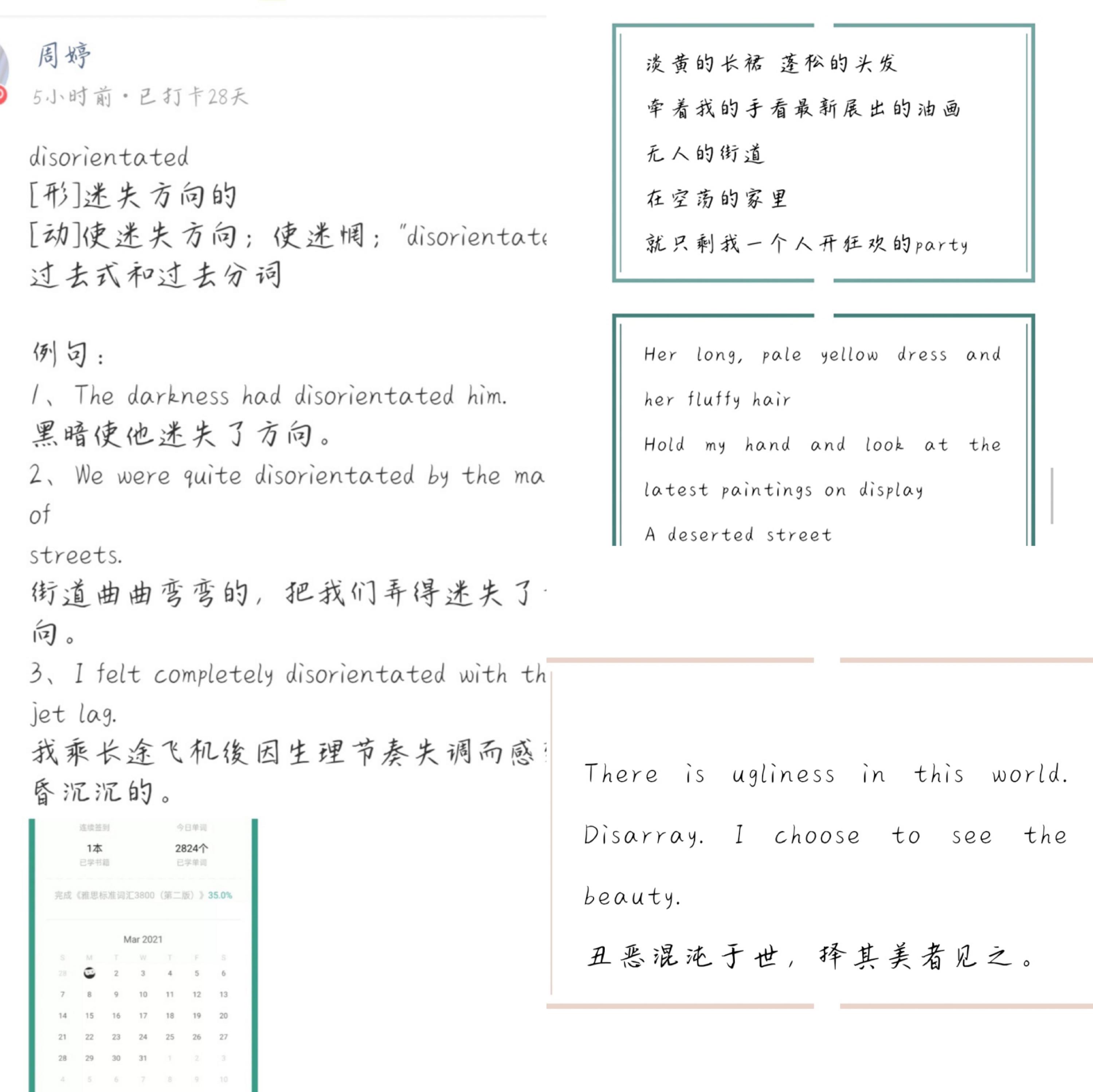 为号召大家寒假坚持学英语,学院以课程“英语词汇背诵与应用”的形式,进行为期四周的单词打卡活动,同学们以自己喜欢的形式深入剖析一个单词的多个方面;四个周末的作业涵盖汉英互译、配音和写作,以微信投票的形式展示大家的成果。希望认真对待每个单词的态度能带给大家合适的学习体验,希望语言积累的习惯能够伴随大家一生。
