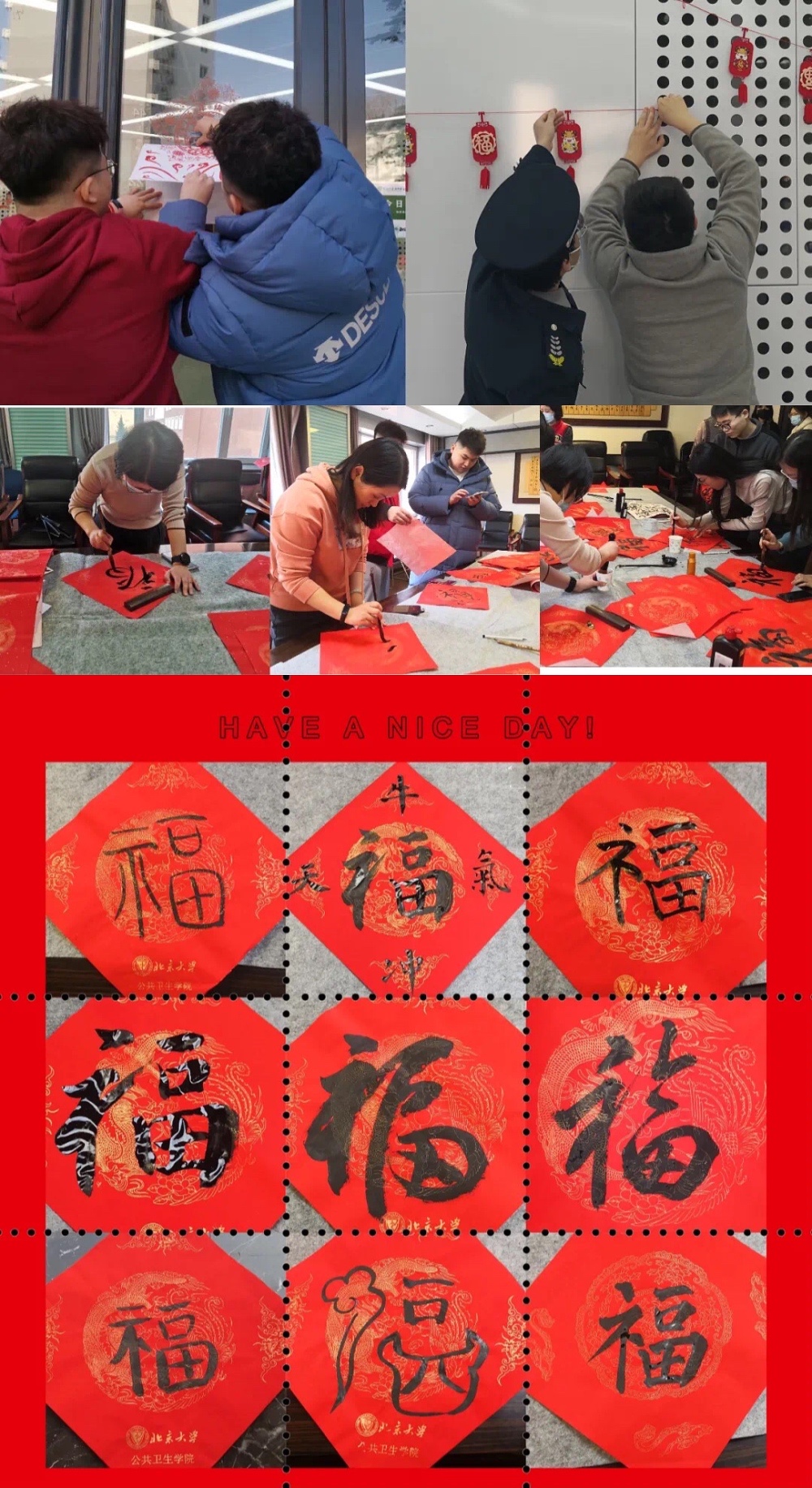 春节是中华民族阖家团圆的重要传统节日。2021年寒假,为了响应“非必要不离京”的疫情防控要求,公共卫生学院的很多师生放弃和家人团圆的机会,就地过年。为了丰富寒假生活,营造新年氛围,让师生过一个意义非凡、充满年味的春节,学院精心策划了一系列活动,留校过年并不孤单,返乡也有线上活动。丰富多彩的活动让大家一起度过了一个温馨又有意义的牛年春节。让我们一起来回顾一下吧!