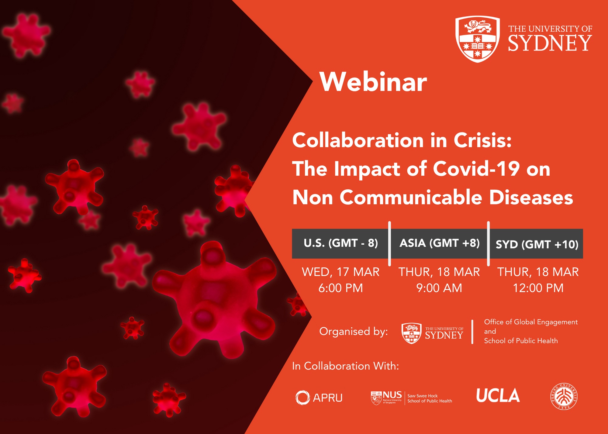 由环太平洋大学联盟(Association of Pacific Rim Universities, APRU)主办,悉尼大学公共卫生学院(The University of Sydney, Sydney School of Public Health)组织的第四届APRU公共卫生危机管理网络研讨会(Fourth APRU Crisis Management Webinar),于北京时间2021年3月18日在Zoom会议平台举行。会议的主题是Collaboration in Crisis: The Impact of Covid-19 on Non-Communicable Diseases,会议由悉尼大学公共卫生学院院长Prof. Joel Negin主持。
