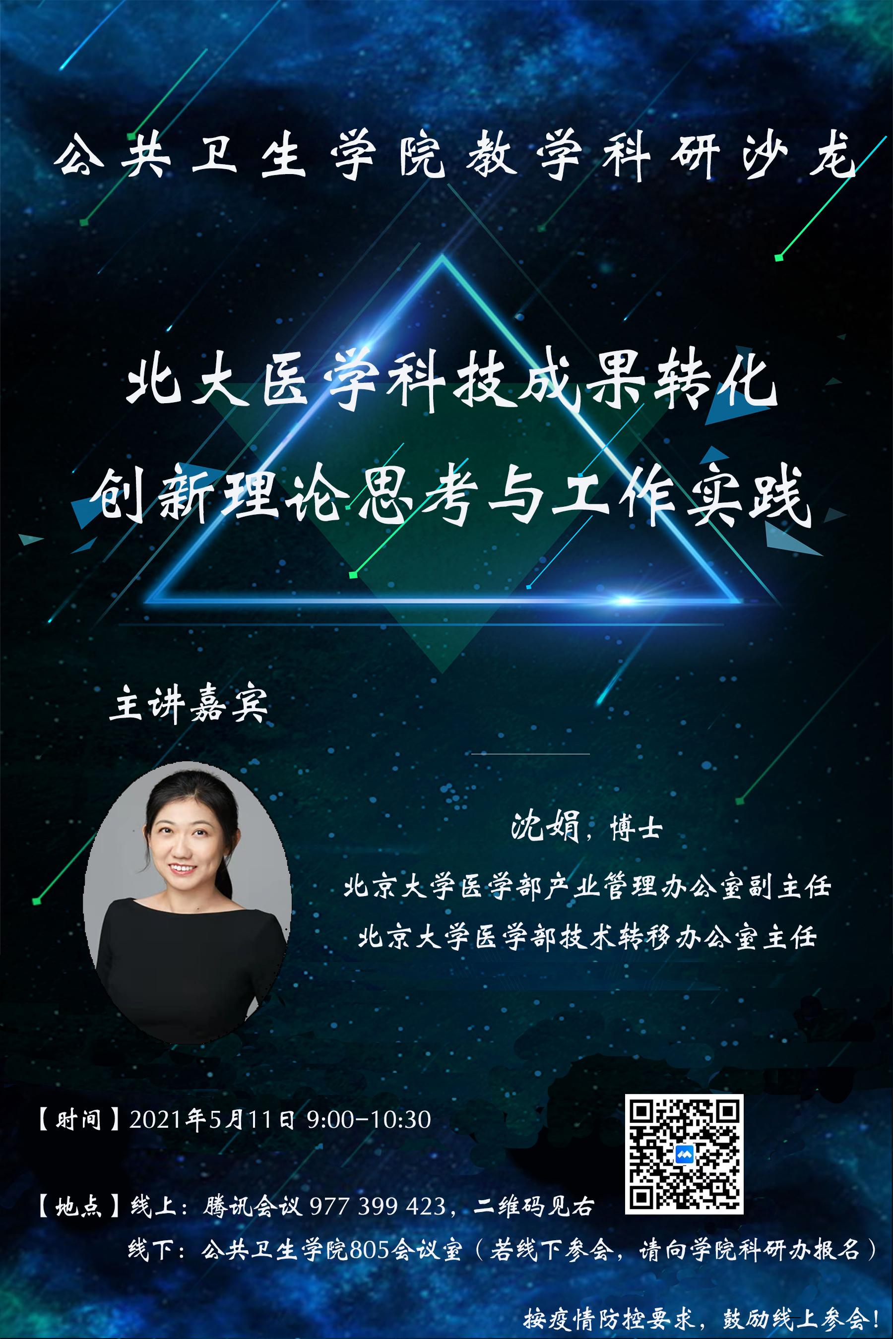 沙龙于2021年5月11日上午9点在公卫学院805会议室举行,为方便老师们参会,以腾讯会议方式线上线下同时进行,使更多老师有机会学习。本次沙龙特别邀请了医学部产业管理办公室副主任、技术转移办公室主任、北大医学科创中心运行理事会秘书长沈娟博士,为学院教师做题为“北大医学科技成果转化创新理论思考与工作实践”的报告。沈娟博士2012年毕业于北京大学公共卫生学院,目前负责医学部技术转让、校企横向科研、知识产权管理及产学研合作等相关工作,在科技成果转化方面具有丰富的工作经验。来自学院十二个系、所、中心的二十多名教学、科研人员以及感兴趣的研究生们参加了活动。