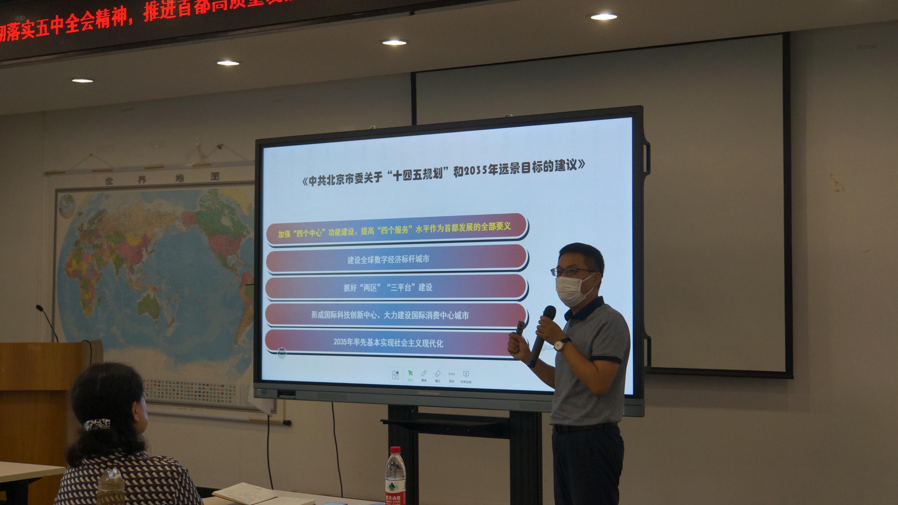 本次讲座的主题为“贯彻落实五中全会精神,推进首都高质量发展”。尹教授围绕十四五规划,阐述了首都北京的高质量发展历史与进程,同时也为老师同学们解读了首都在“十四五”规划和2035远景目标中的发展方向。