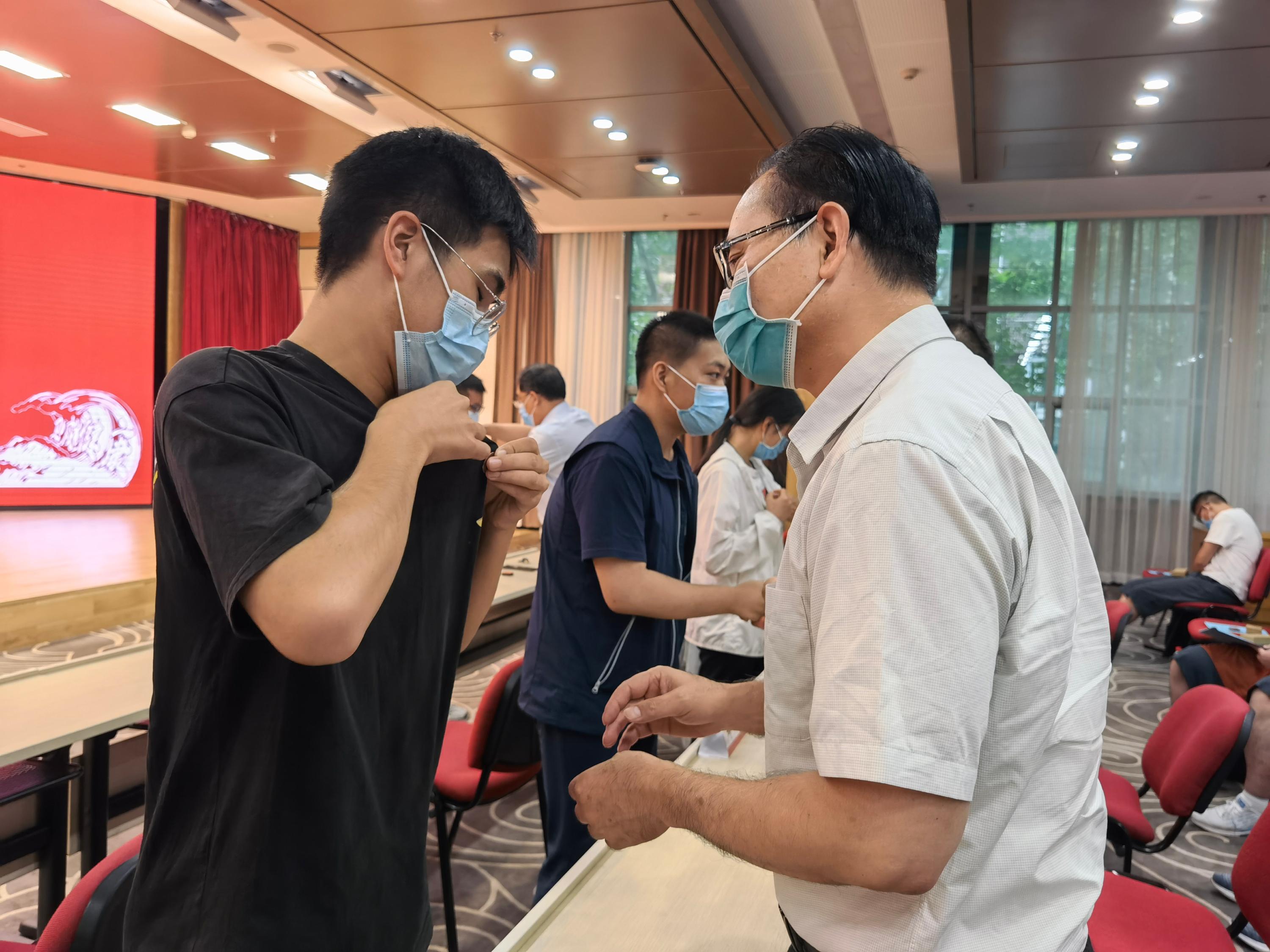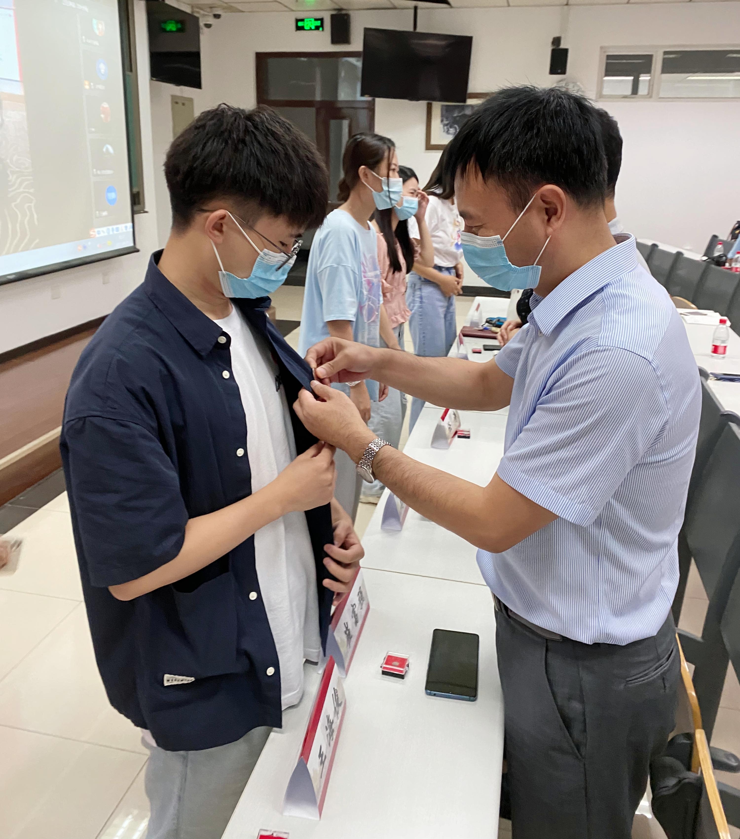 随后,与会领导和老师向新生代表赠送并佩戴北京大学公共卫生学院院徽。