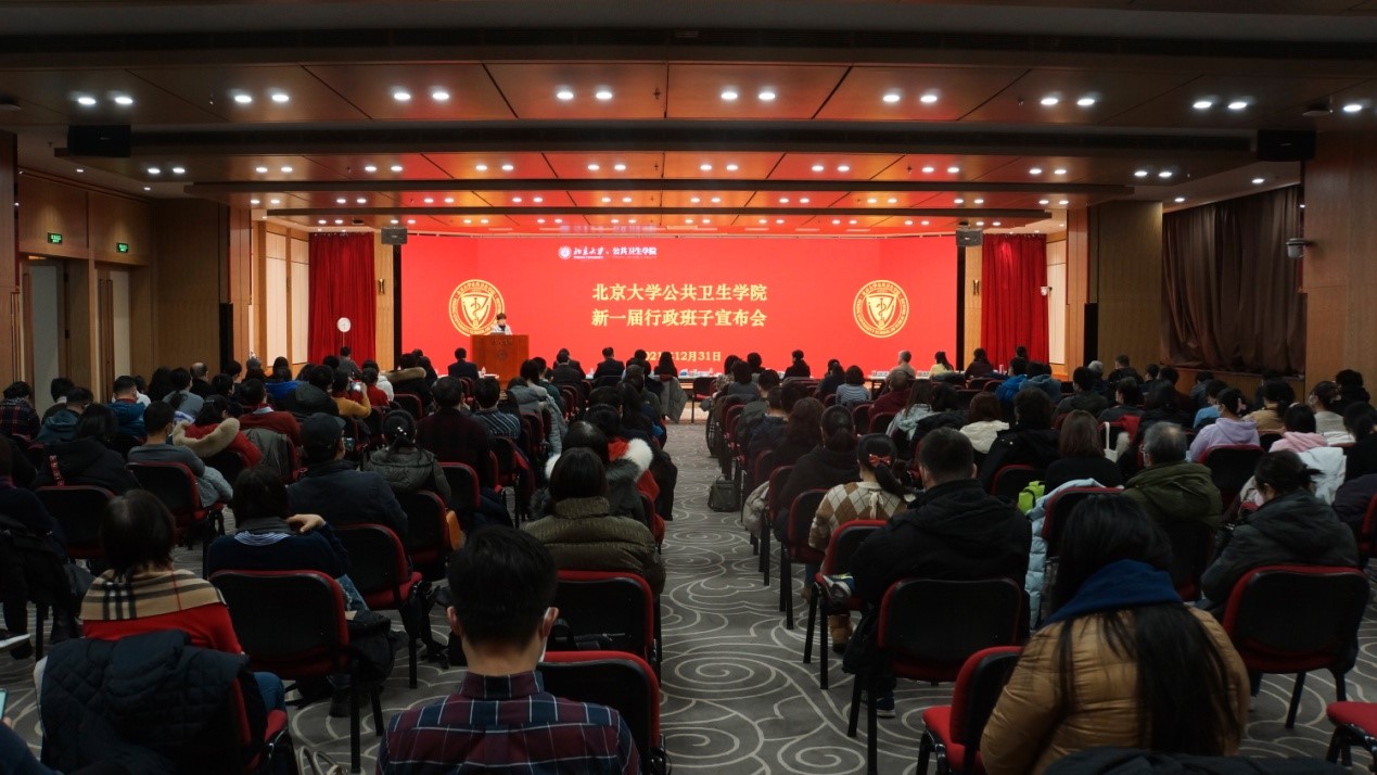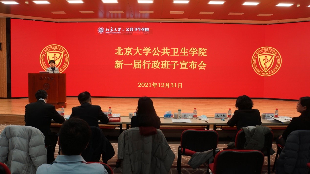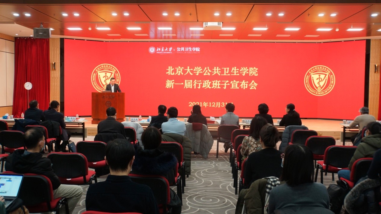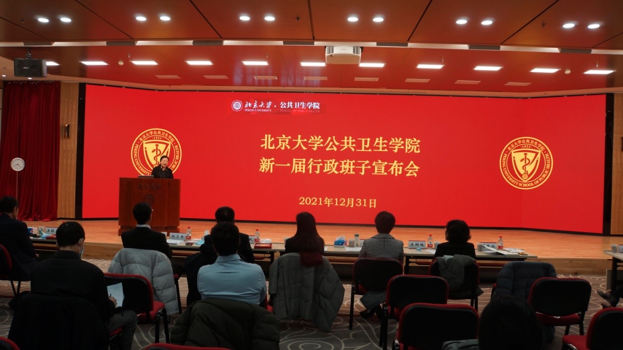 2021年12月31日,北京大学公共卫生学院新一届行政班子宣布会在逸夫楼209会议室召开。北京大学常务副校长、医学部主任乔杰院士、北京大学党委组织部部长宁琦同志、北京大学医学部党委副书记兼组织部部长朱树梅同志出席。公共卫生学院新老党政领导班子全体及教职工约160人参加会议。会议由学院党委书记郝卫东同志主持。