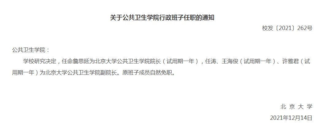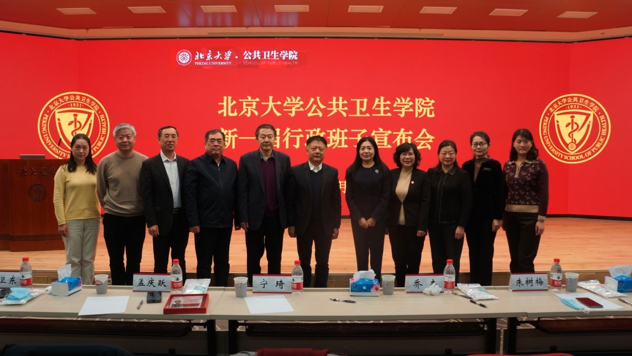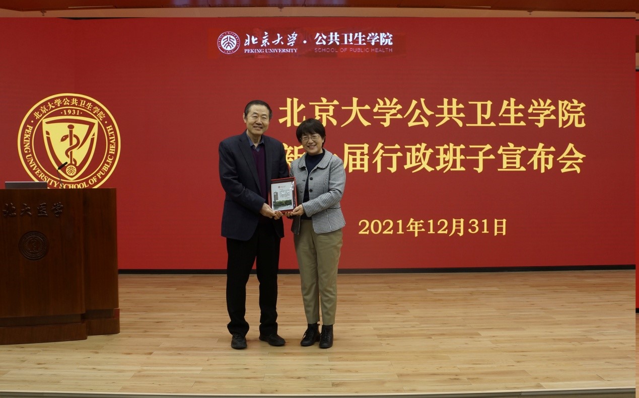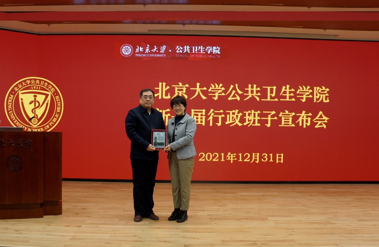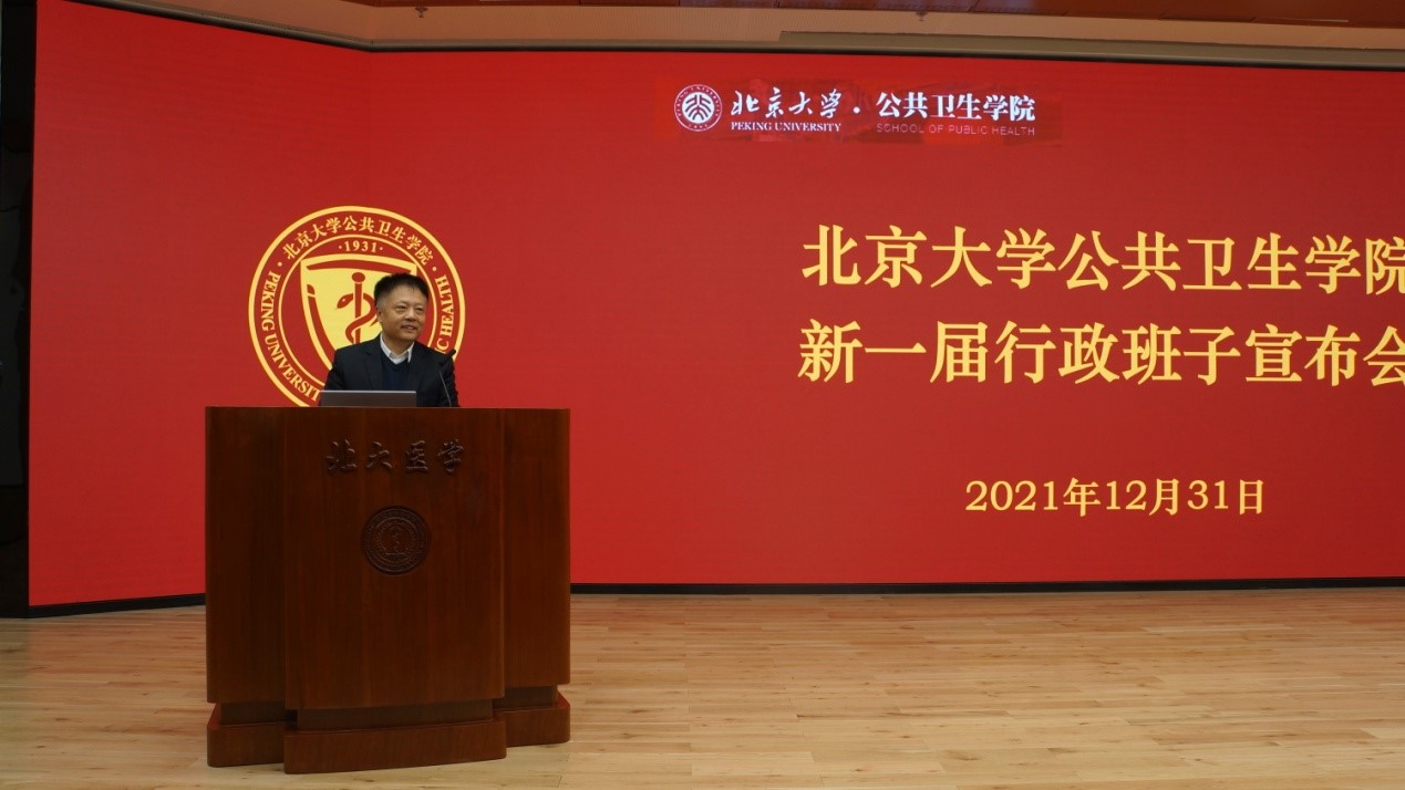 2021年12月31日,北京大学公共卫生学院新一届行政班子宣布会在逸夫楼209会议室召开。北京大学常务副校长、医学部主任乔杰院士、北京大学党委组织部部长宁琦同志、北京大学医学部党委副书记兼组织部部长朱树梅同志出席。公共卫生学院新老党政领导班子全体及教职工约160人参加会议。会议由学院党委书记郝卫东同志主持。