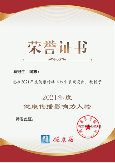 近日,由国家卫生健康委员会主管的全国卫生行业报——健康报社组织开展的2021年度医学科技与健康传播“最佳”系列推选活动结果出炉。经过全方位、多角度的考核与评估,推选出了健康传播人物类、团队类与组织类等多个奖项,我院营养与食品卫生学系主任马冠生教授荣获“2021年度健康传播影响力人物称号”。