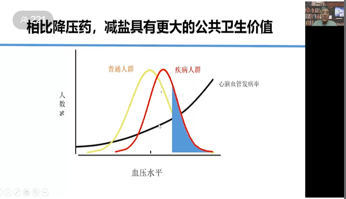 “心脑血管病导致国人45%的死亡,是名副其实的头号杀手,预防心脑血管病关键在于预防和控制高血压,减盐是最有效非药物降压措施。相比降压药,减盐具有更大公共卫生价值,并能够节省医疗卫生花费。”北京大学临床医学研究所所长武阳丰也在线上作了《我国的减盐实践》报告,并提出了相关政策建议,把高盐饮食文化变为低盐饮食文化,制定加工食品盐含量标准,鼓励生产和营销低钠盐和低钠食品,加强科学研究等。