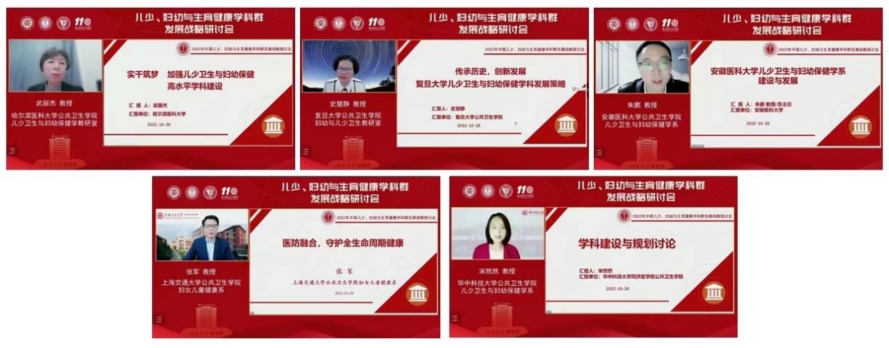 第二部分由北京大学儿童青少年卫生研究所宋逸所长主持。哈尔滨医科大学武丽杰教授进行《实干筑梦,加强儿少卫生与妇幼保健高水平学科建设》报告;复旦大学史慧静教授进行《传承历史,创新发展:复旦大学儿少卫生与妇幼保健学科发展策略》报告;安徽医科大学朱鹏教授进行《安徽医科大学儿少卫生与妇幼保健学系建设与发展》报告;上海交通大学张军教授进行《医防融合,守护全生命周期健康》报告;华中科技大学同济医学院宋然然教授进行《学科建设与规划讨论》报告。