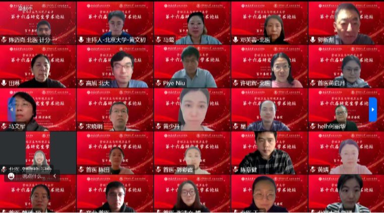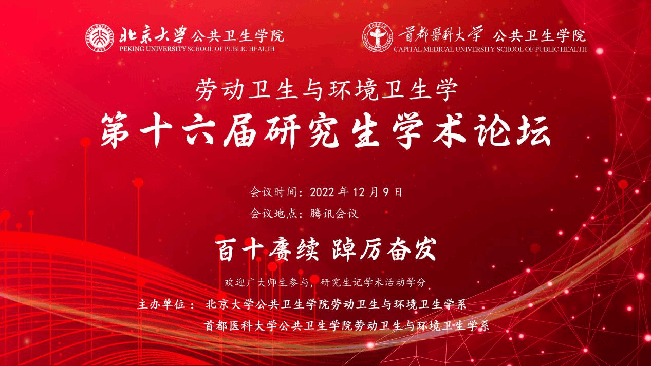 2022年12月9日,由北京大学公共卫生学院和首都医科大学公共卫生学院联合主办的“第十六届劳动卫生与环境卫生学研究生学术论坛”圆满结束。本次论坛以“百十赓续,踔厉奋发”为主题,旨在促进两校科研合作和交流、进一步提升学生科研素质与创新能力。会议采用腾讯会议方式,两校公卫学院劳动卫生与环境卫生学系的师生们再次在线上“欢聚一堂”,共有六名博士研究生和十名硕士研究生进行学术汇报,所有副高级职称以上的参会老师们担任评委,参会的师生们积极思考、踊跃提问,总计113位来自两校及全国其他兄弟院校相关领域的师生们共享了此次学术盛宴。