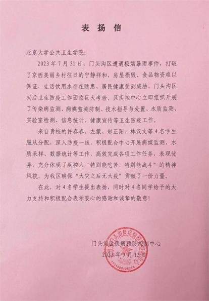 2023年7月29日至8月2日,北京市门头沟区遭遇极端暴雨事件,门头沟区疾控中心迅速组织开展了一系列卫生防疫工作,来自北京大学公共卫生学院的四位实习同学深入防疫一线,积极配合完成了各项工作任务,荣获表扬信。