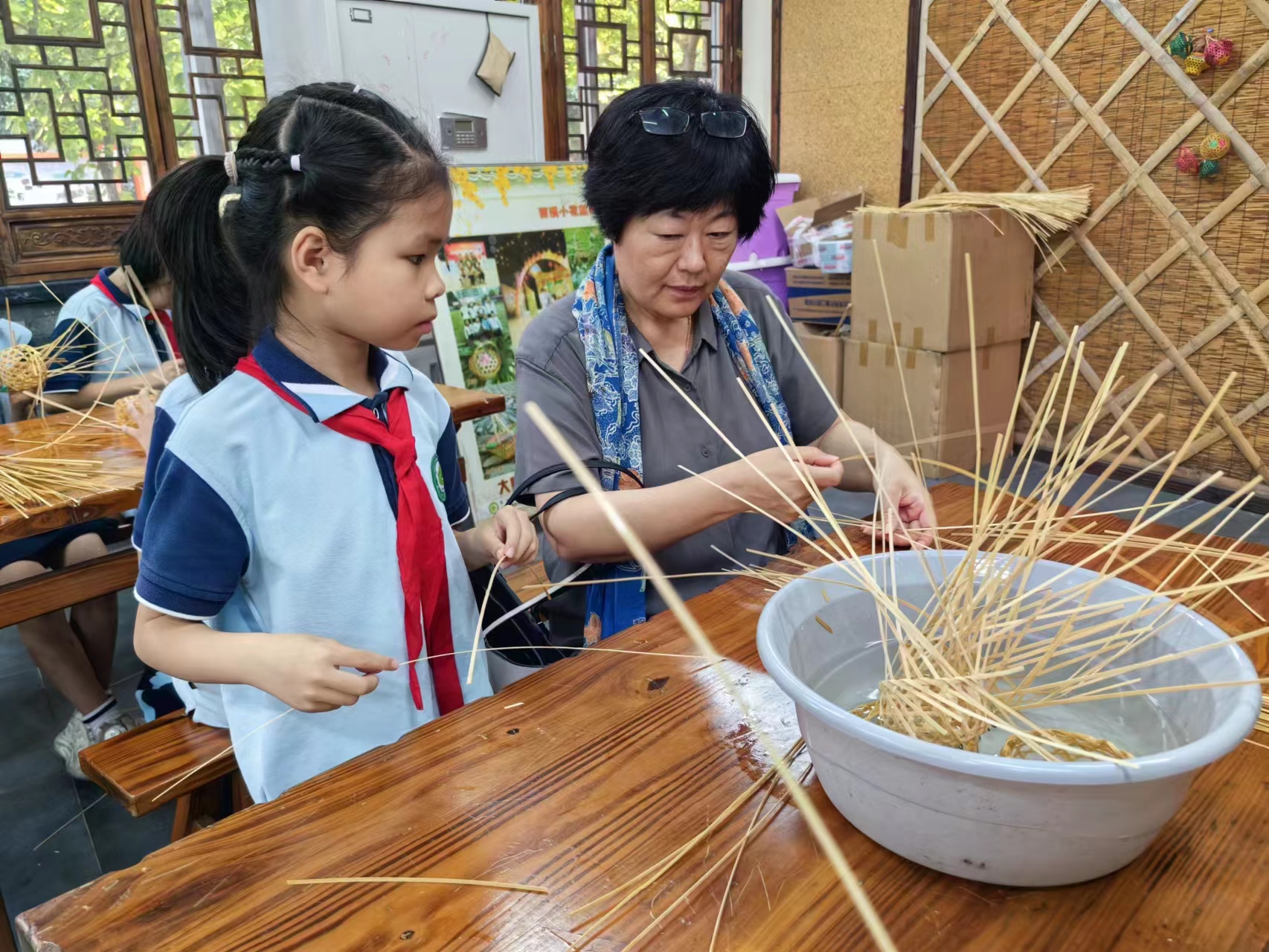 图3马迎华教授在杭州市留下小学与同学一起编竹篓