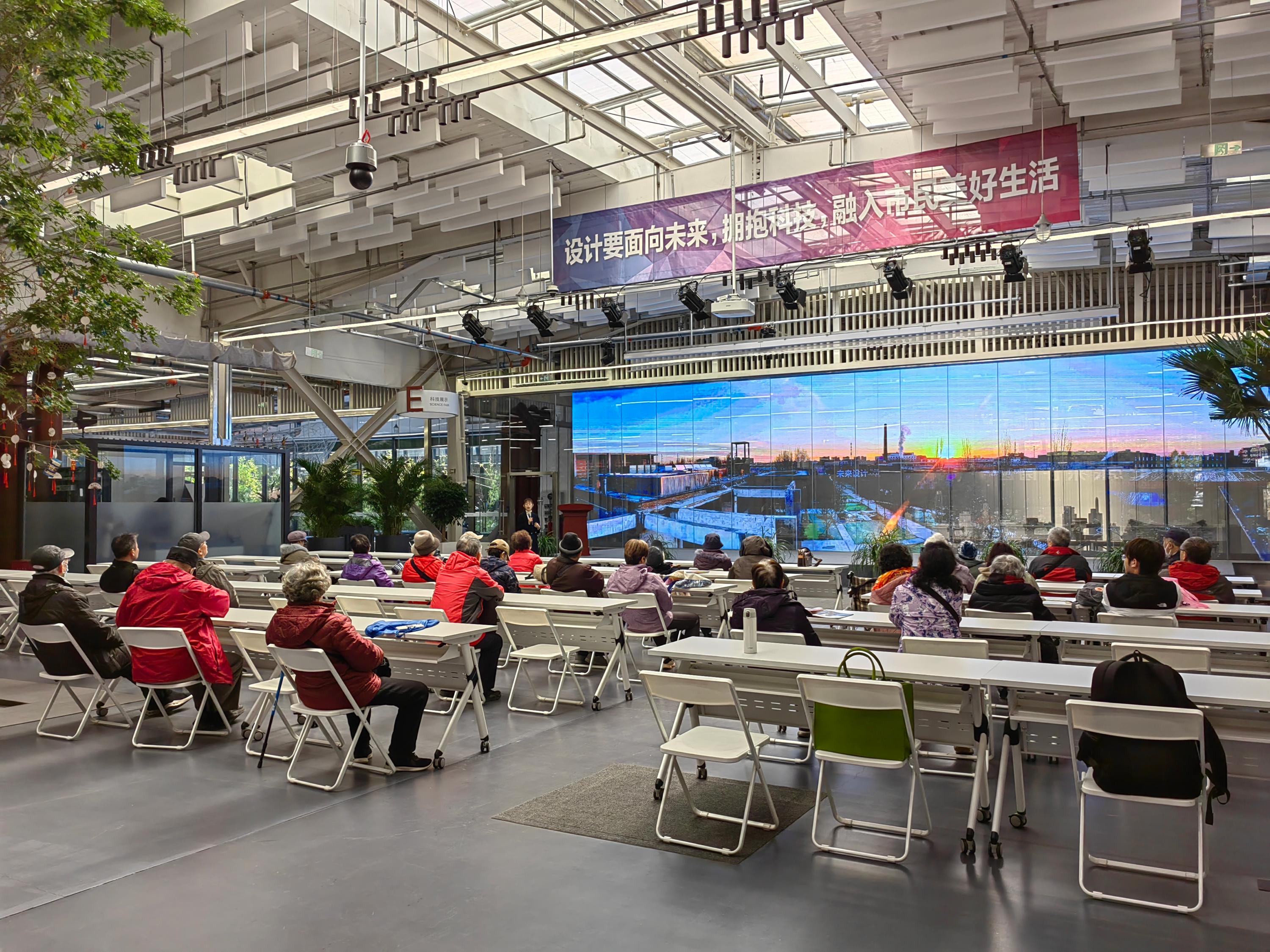 随后,全体人员驱车来到张家湾设计小镇,通过观看宣传片大家了解了小镇的发展历程和全域规划,驻足在原北京铜牛厂被改造成的“兼具设计感、科技感、工业感、未来感和幸福感”的北京未来设计园里,老教师们亲身体验建设者用绿色节能环保理念建造的舒适的室内环境,同时,也被一件件具有年代感的北京铜牛制衣厂留下的如工业缝纫机等设备所吸引,对现代设计理念中如何加强对工业遗产的改造、利用和更新有了新的理解和认识;在用3D打印设备建造的房子面前,大家感叹技术的进步带给人们生活的便利,大家相互交流着近几年来城市的建设与变化,感叹国家的高速发展。