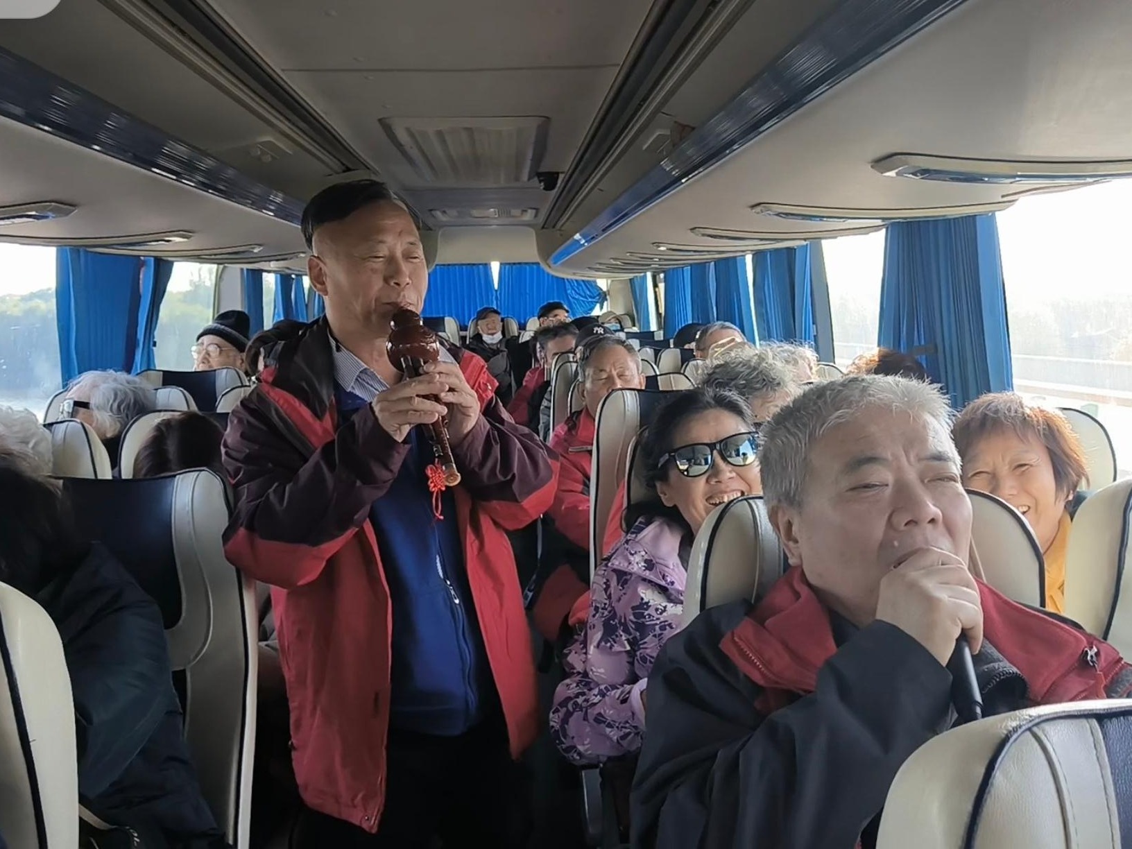返程的路上,老教师们和着优美的葫芦丝伴奏高声歌唱,祝福祖国繁荣昌盛,车上洋溢着欢声笑语。