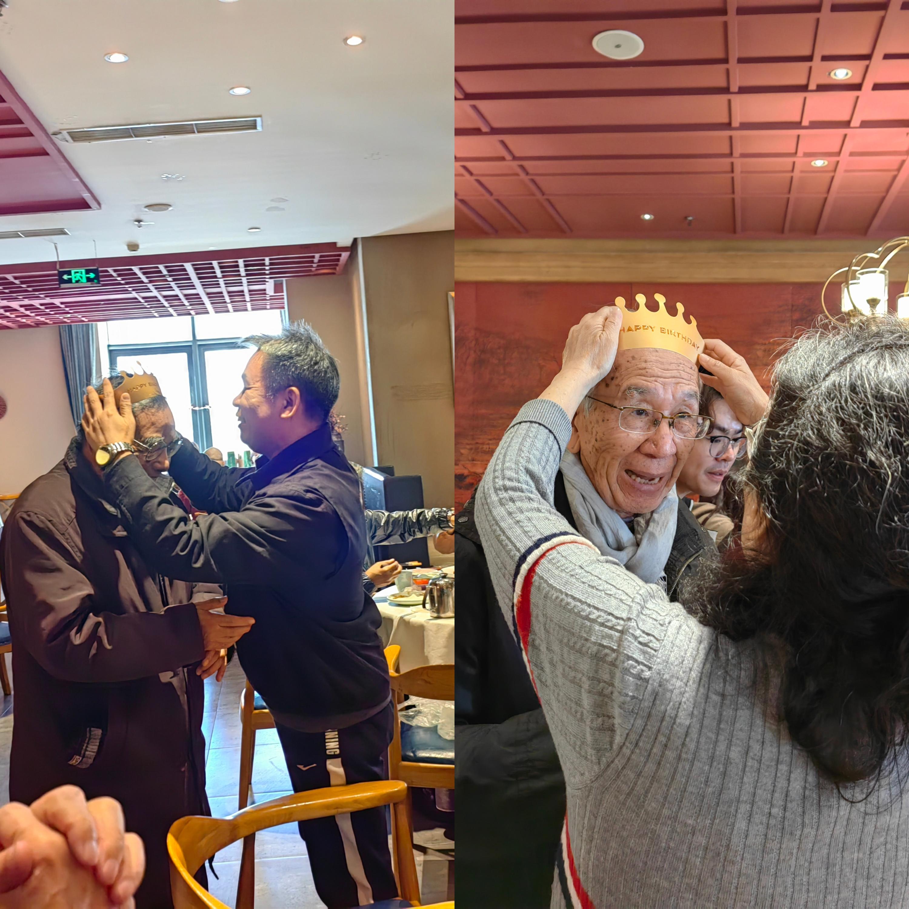 午餐会上,院党委副书记苏鸿老师代表学院为老教师们送去了问候,表示这是疫情之后学院组织大家第一次集体外出,感谢大家对学院发展的关心,感谢他们为学院的发展建设、人才培养等各方面所付出的辛勤劳动,并祝愿老教师们身体健康。为表达对老教师们的敬意,此次活动安排了一个特殊环节,就是为年龄超过80岁、进入朝枚之年的7位参加本次活动的老教师集体过生日,老教师们头戴生日帽,全体人员集体唱起生日歌,为他们送上了深深的祝福,沈惠麒、唐仪两位老师为大家切开蛋糕,分享着各自的喜悦和感动。