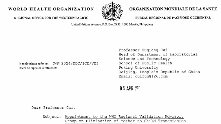 北京大学公共卫生学院崔富强教授受聘为世界卫生组织西太区专家