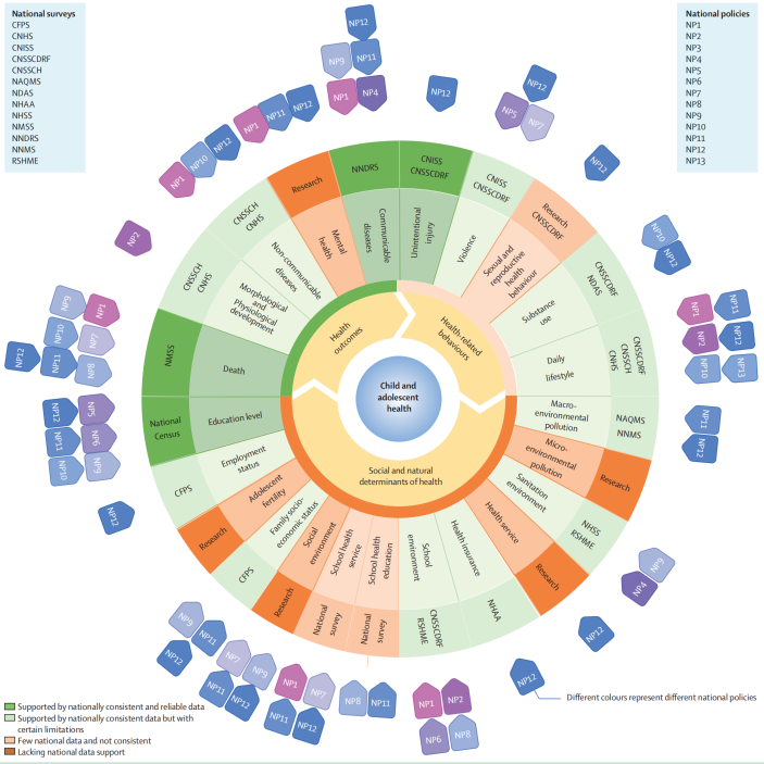 图1:中国儿童青少年主要健康结局、健康风险以及影响健康的社会和自然决定因素的国家调查和政策来源