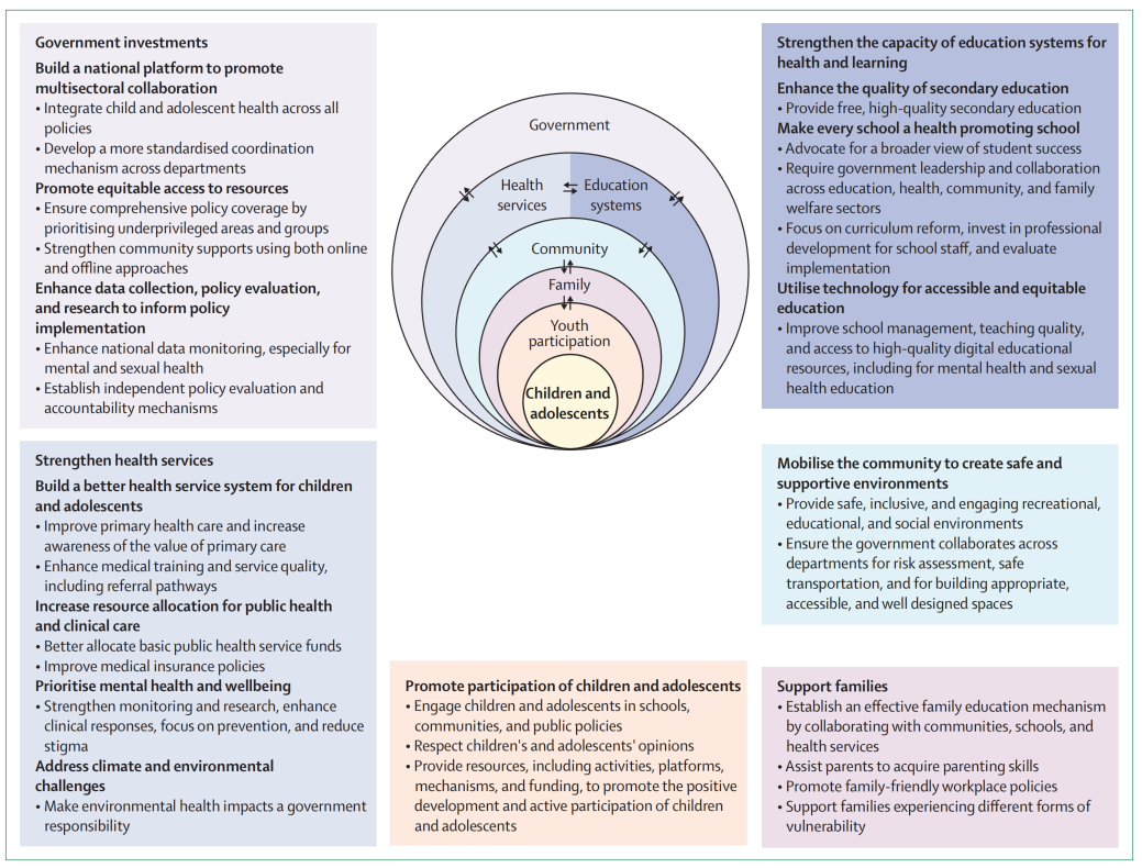 青春期具有身体、认知和社会发展的深远潜力,因此被视为继婴幼儿期之后的“第二个关键窗口期”。《柳叶刀》青少年健康委员会呼吁全球关注青春期三重红利带来的潜力,这种潜力可以通过投资青少年及其健康与福祉,并从青春期延续到成年期,再传递到下一代来实现。鉴于儿童青少年对于实现可持续发展目标至关重要,世界卫生组织建议每个国家均实施国家政策和战略,促进和保护儿童青少年的健康与福祉。这一建议与联合国对青年人的倡导,以及学术界更加关注当代儿童青少年健康需求的呼吁相一致。