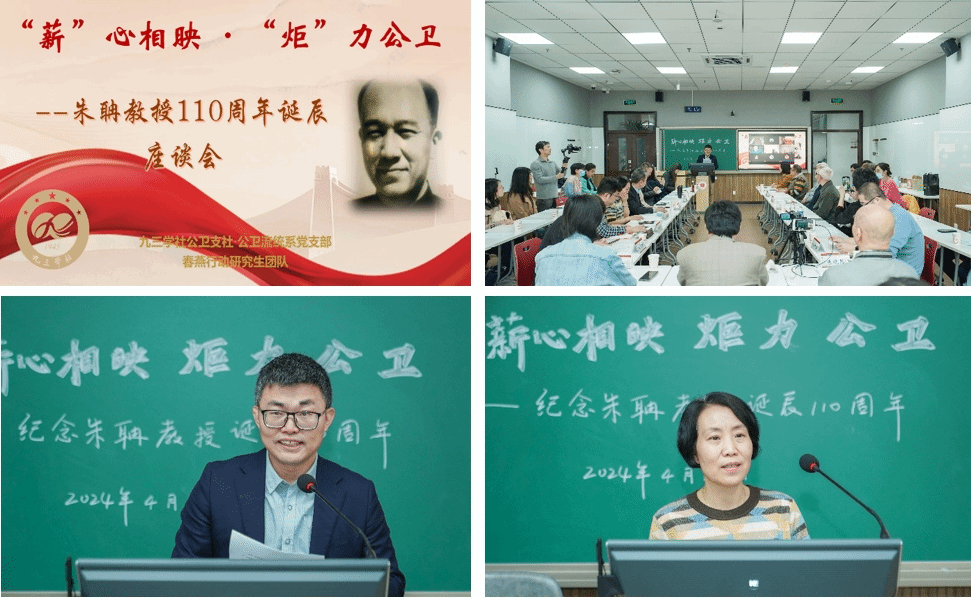 2024年4月15日,由九三学社北京大学第二委员会公共卫生学院支社(以下简称公卫支社)、中共公共卫生学院流行病与卫生统计学系支部及工会、春燕行动团队研究生联合主办的“薪”心相映,“炬”力公卫——纪念朱聃教授110周年诞辰的座谈会在逸夫楼208会议室召开。会议以线上线下相结合的方式进行,北京大学医学部党委统战部副部长陈子豪、公共卫生学院党委副书记苏鸿、九三学社北京大学第二委员会委员、基础医学院支社主委郑瑞茂教授、公卫支社副主委朱文丽、副主委邓芙蓉、北京协和医学院张孔来教授、九三学社中央医卫委员会委员、清华大学尤劲教授、北京大学人民医院李春英教授、公共卫生学院陈育德教授、魏承毓教授、王振刚教授、钮文异教授、陈新教授等特邀嘉宾,公共卫生学院流行病与卫生统计系党支部书记吴涛教授、儿童青少年卫生研究所所长、党支部书记宋逸教授、朱聃教授家属,以及公卫支社和流统系师生代表50余人参加了座谈会。