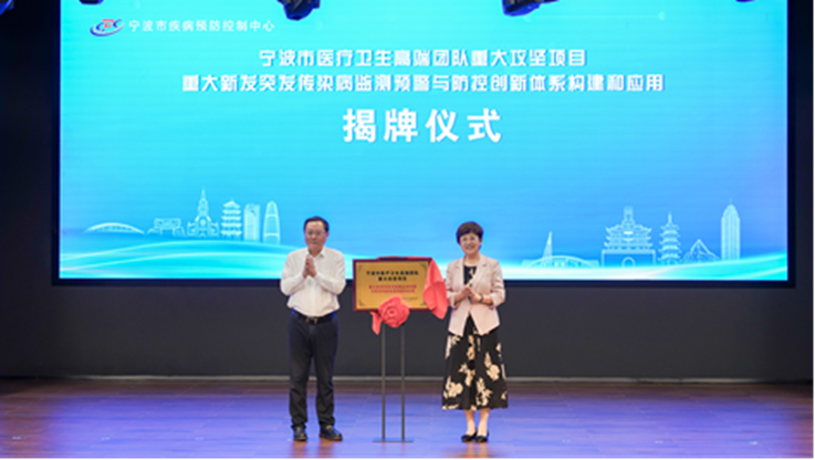 在宁波市疾病预防控制中心,宁波市卫生健康委员会主任、党委书记俞曹平、市科协党组书记方巍、市卫生健康委党委委员、市疾控中心主任童峰等当地领导隆重接待了代表团一行。乔杰院士出席宁波市医疗卫生高端团队重大攻坚项目《重大新发突发传染病监测预警与防控创新体系构建和应用》的启动仪式,并与俞曹平书记共同为该项目揭牌。