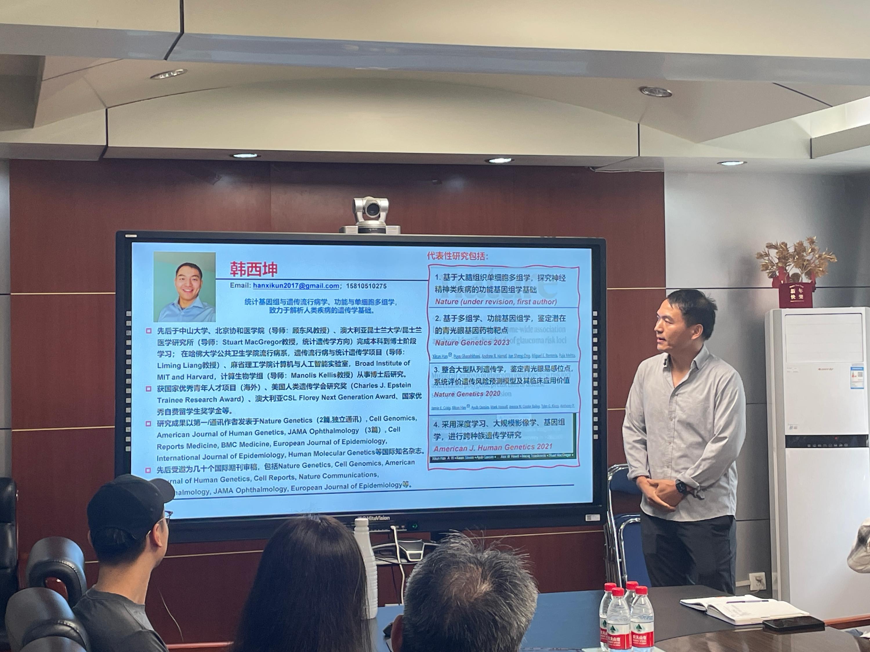 在新学期开始之际,为使新职工更快融入公卫学院大家庭,搭建学术交流平台,公卫学院工会双语系列活动之“你的新同事来啦”——学术分享会,于9月26日在新公卫楼220会议室举行,活动邀请2024年新入职的海外优青科学基金获得者韩西坤和郑棒两位老师就本人主要研究方向和科研成果进行了主旨报告。公共卫生学院党委副书记、工会主席苏鸿、副院长任涛、王海俊以及来自各学系的教师、学生代表等共20余人参加了报告会,活动由流行病与卫生统计系副主任、党支部书记、学院双语教学小组组长吴涛教授主持。