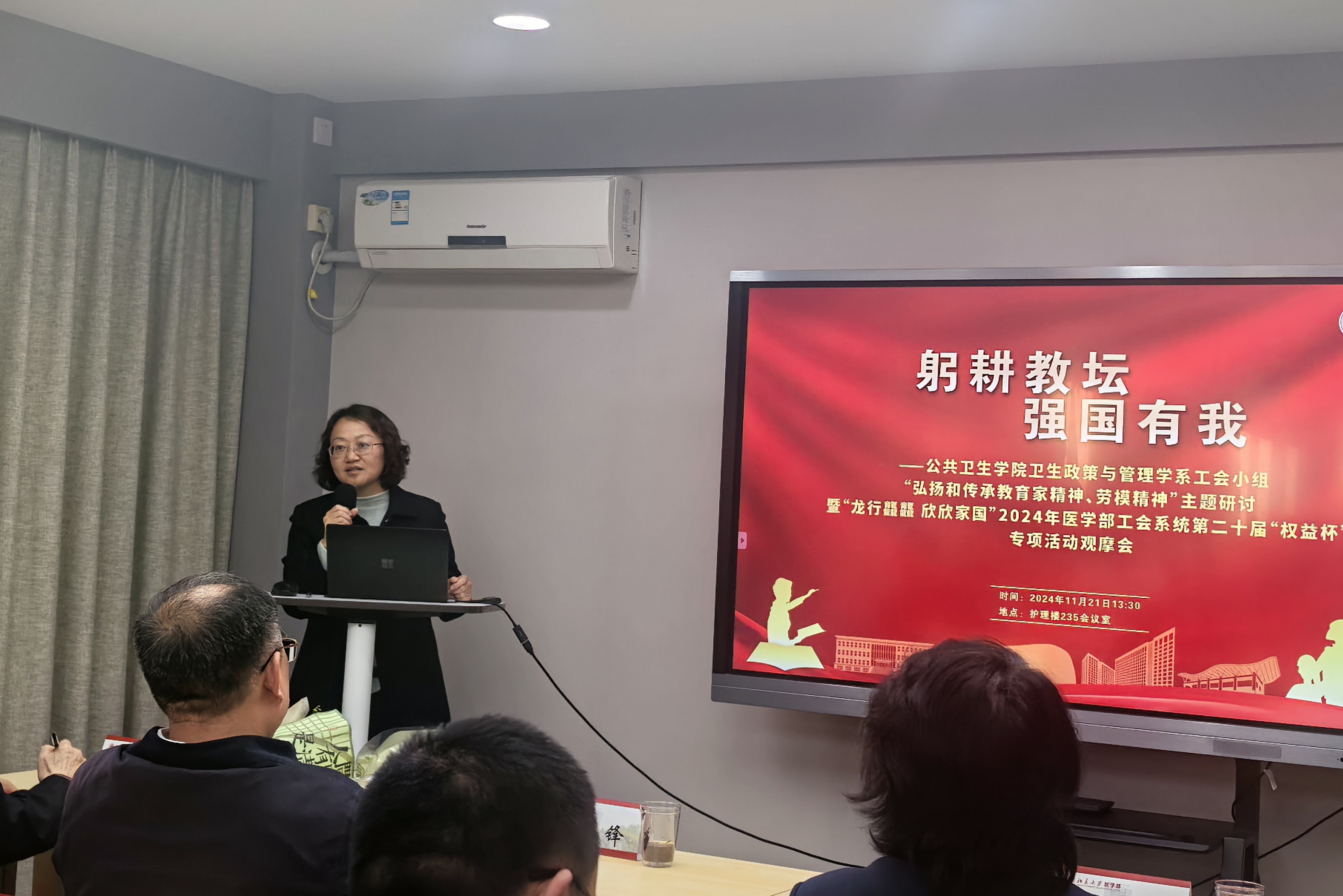 1121日下午,北京大学公共卫生学院卫生政策与管理学系(以下简称卫管系)工会小组弘扬和传承教育家精神、劳模精神主题研讨暨龙行龘龘 欣欣家国”2024年医学部工会系统第二十届权益杯专项观摩活动在卫管系235会议室顺利举行。作为医学部工会第二十届权益专项活动,活动邀请了原公共卫生学院院长、卫管系主任陈育德教授,原医学部主任助理、公共卫生学院副院长、卫管系主任吴明教授,原公共卫生学院副院长、卫管系副主任王志锋教授做主题发言。医学部工会副主席董惠华,北京大学肿瘤医院党委副书记、工会主席许秀菊,公共卫生学院党委副书记、工会主席苏鸿,公共卫生学院院长助理、卫管系主任简伟研,卫管系副主任傅虹桥,医学部工会办公室主任张凤云以及来自医学部各二级单位的工会领导和工会同仁参加了本次活动并进行了全程观摩。活动由卫管系工会组长陈博主持。