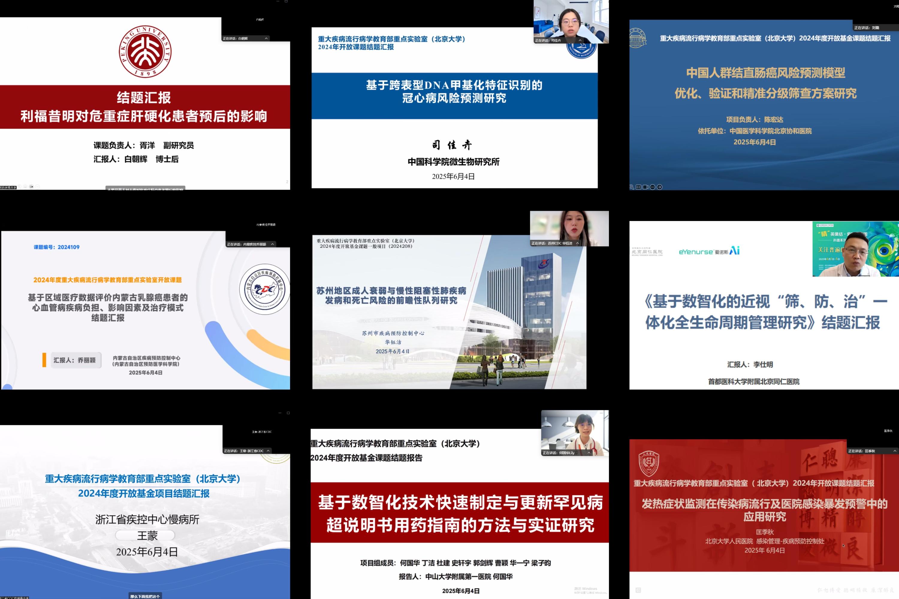 2025年6月4日上午,重大疾病流行病学教育部重点实验室(北京大学)(以下简称“实验室”)2024年开放课题结题汇报在新公卫楼311会议室召开。本次会议采用线上线下相结合的方式进行,由余灿清研究员主持,来自实验室各方向的学术带头人及学术骨干代表参与评审。