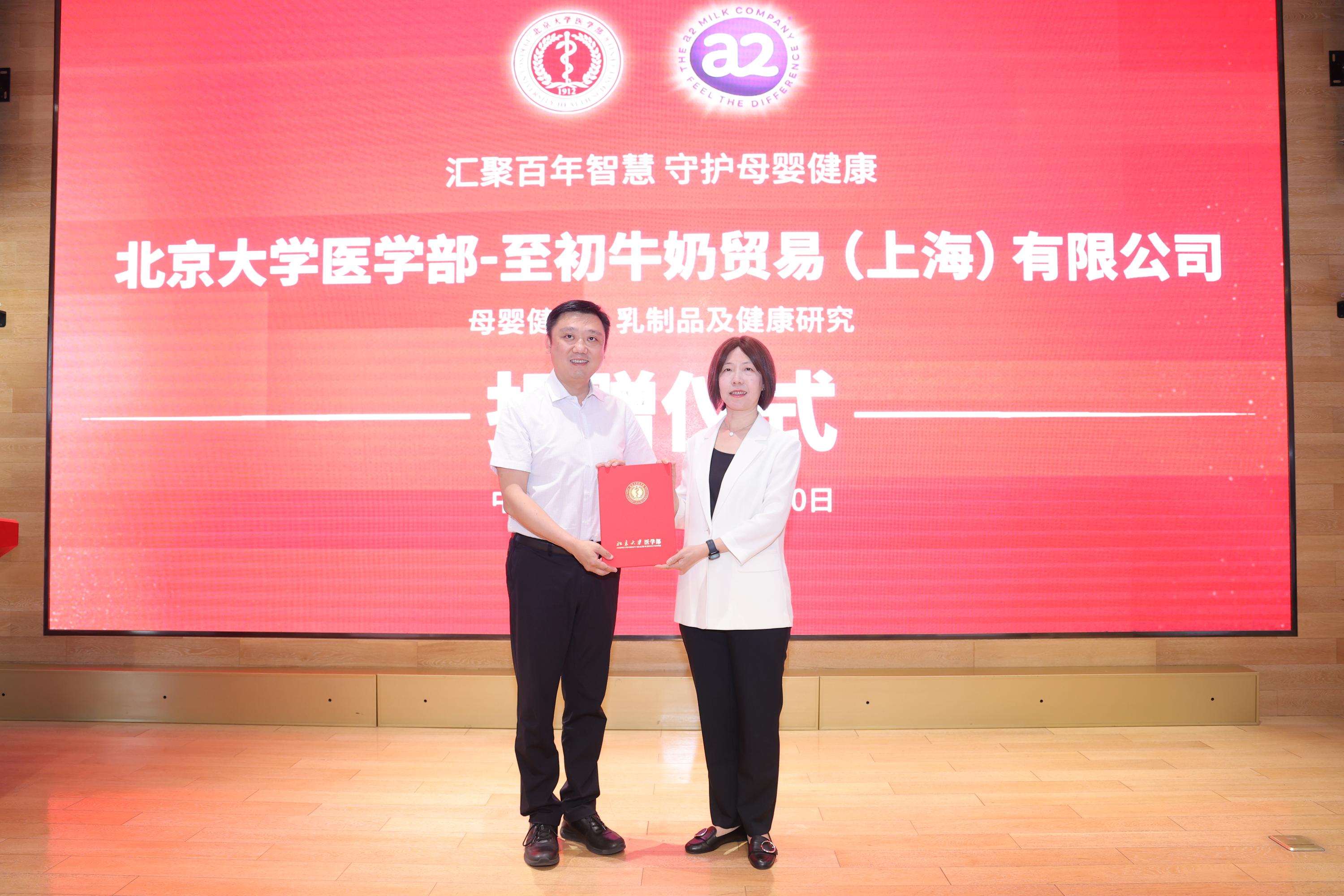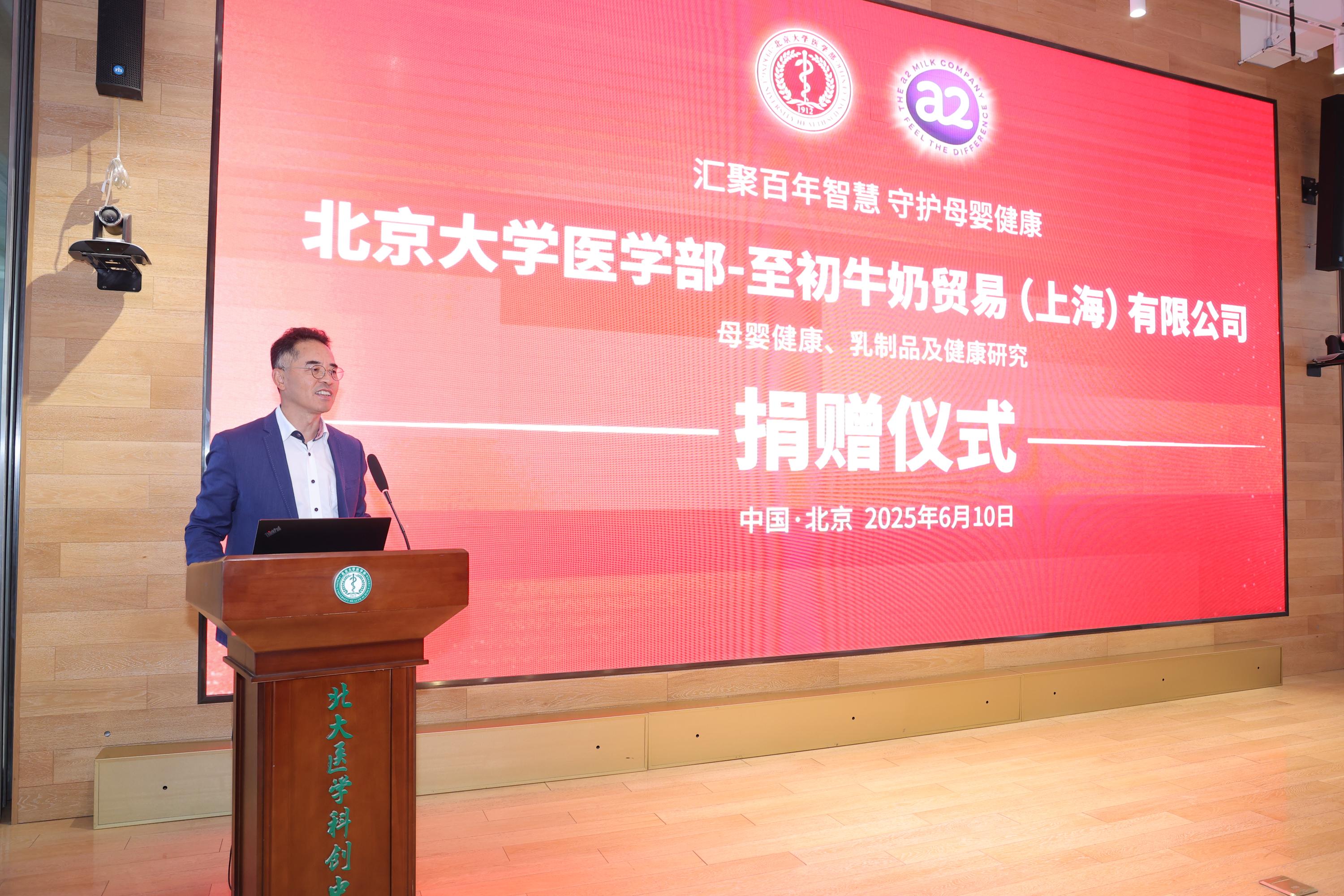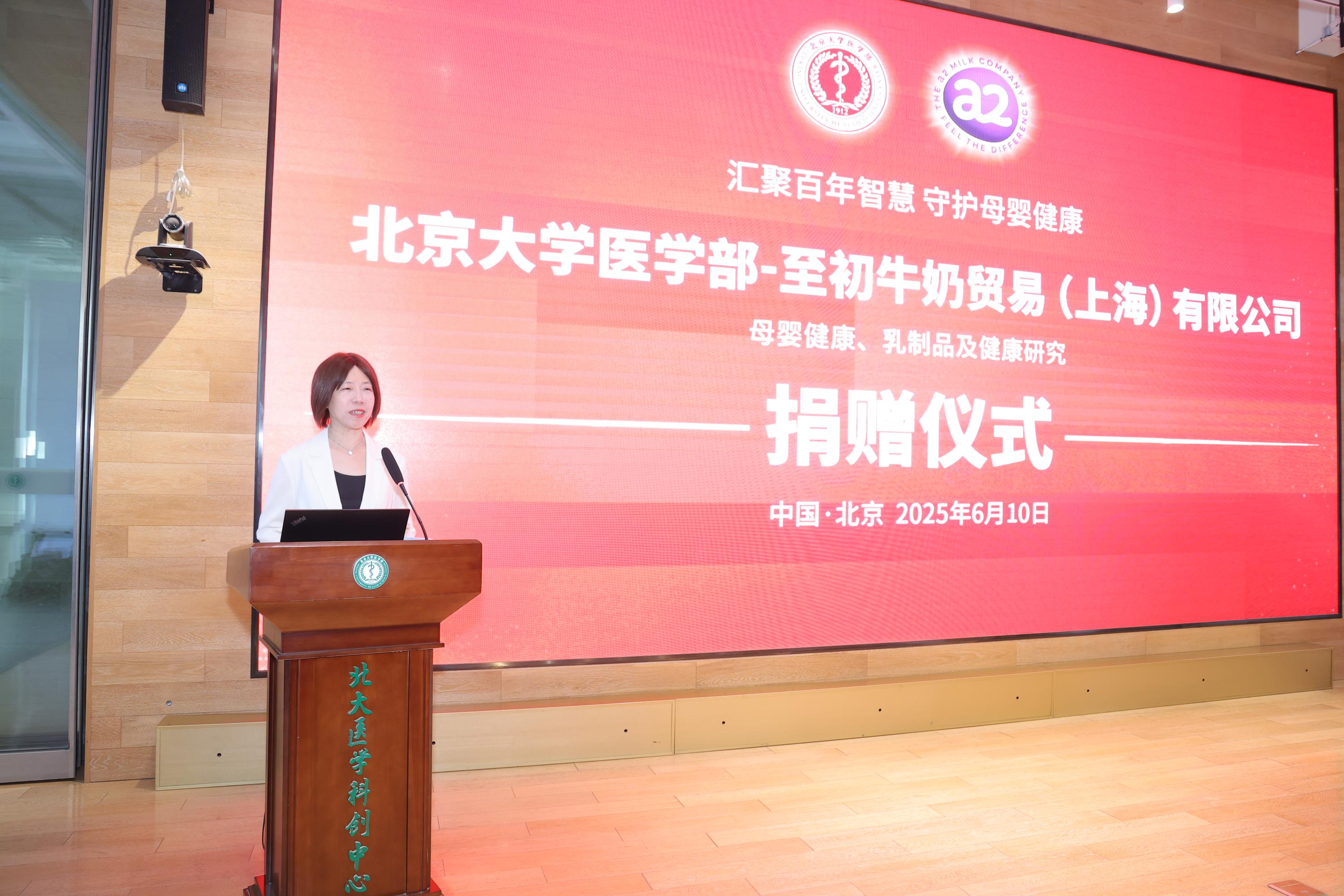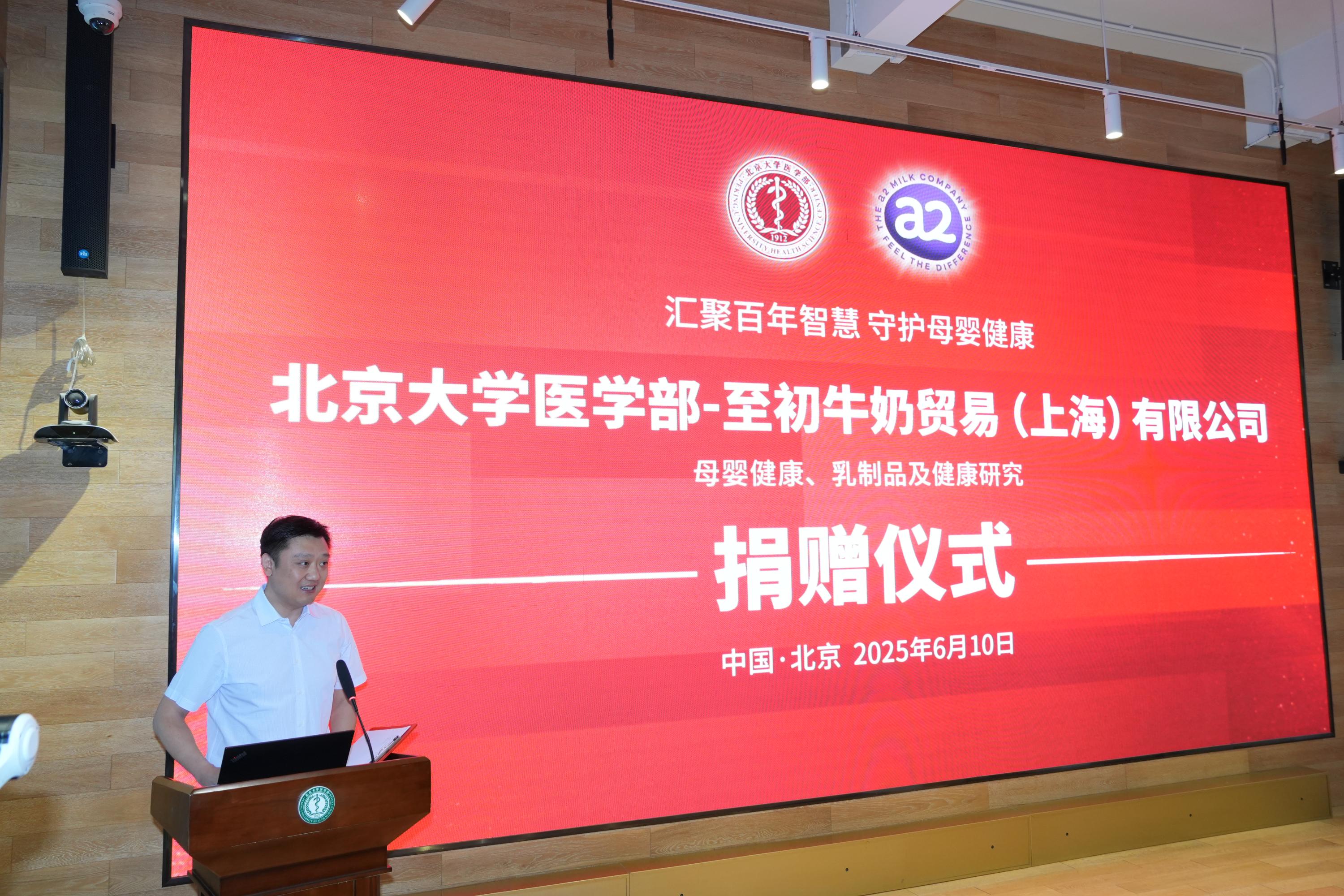 2025年6月10日上午,北京大学医学部至初牛奶母婴健康、乳制品及健康研究项目捐赠仪式在医学部科创中心举行。北京大学医学部副主任肖渊、北京大学公共卫生学院副院长王海俊、医学部校友办暨基金办主任孙莉莉、北京大学公共卫生学院营养与食品卫生学系马冠生教授、至初牛奶贸易(上海)有限公司副总裁王海燕及嘉宾代表、医学部师生出席。王海俊副院长主持仪式。