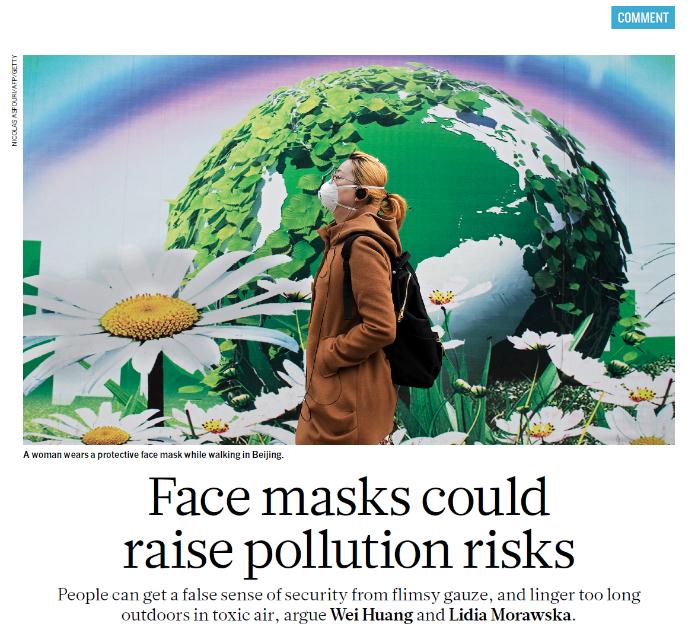 2019年10月3日,全球权威期刊《自然》(IF 43.070)正式发表北京大学公共卫生学院黄薇博士为第一作者和通讯作者的特邀评论文章-《佩戴口罩可能会增加空气污染的健康风险》(Face masks could raise pollution risks, Nature 2019; 574: 29-30)。该文章聚焦全球空气污染背景下公共卫生防护核心问题,首次全面阐述了口罩佩戴在空气污染公众健康防护中的误区,为持续推进空气污染全球治理、从公共卫生促进角度明确提出了一级预防目标!