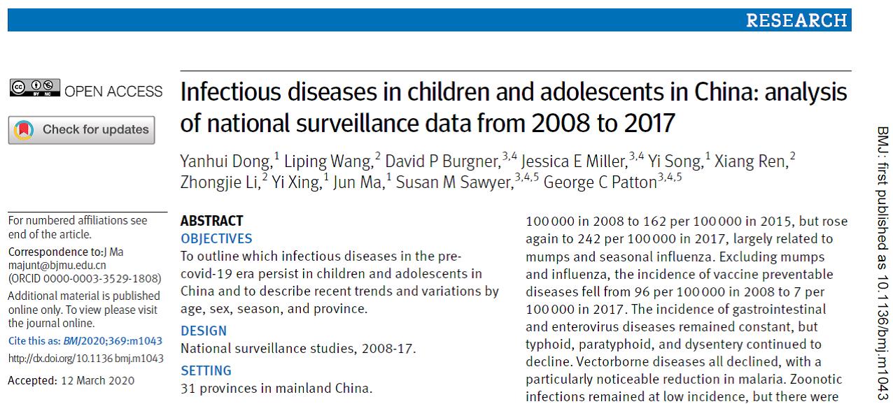 该研究发表于国际权威医学杂志《BMJ》。马军教授和星一副研究员为论文的共同通讯作者,董彦会博士和王丽萍研究员为第一作者,感谢为中国儿童青少年传染病防控做出贡献的所有医疗卫生人员和科研人员。