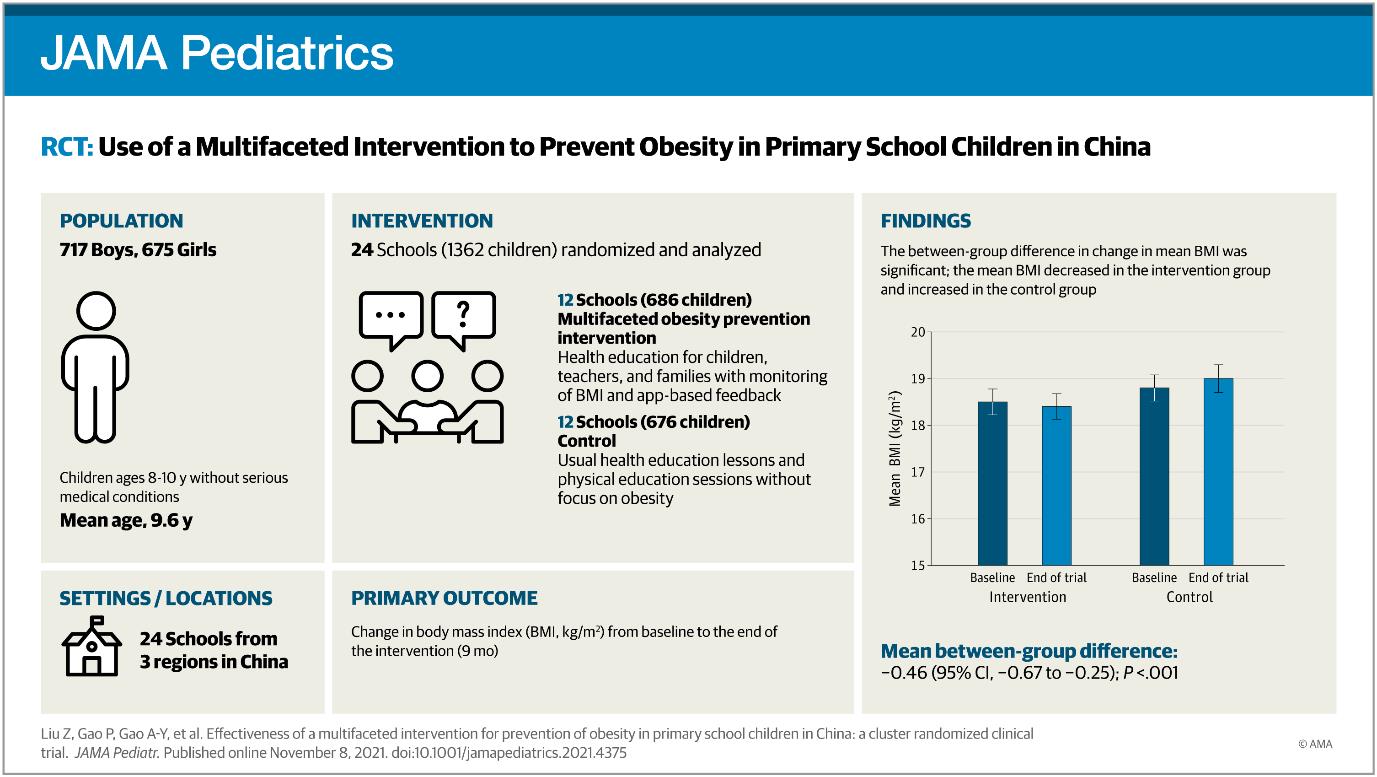 2021年11月8日,国际知名高水平期刊《JAMA Pediatrics》以网页封面论文形式在线发表北京大学公共卫生学院王海俊教授团队研究论文,题目为“Effectiveness of a multifaceted intervention for prevention of obesity in primary school children in China: A cluster randomized clinical trial”,首次报道一项有效预防儿童肥胖的中国多中心整群随机对照试验(RCT)研究成果。