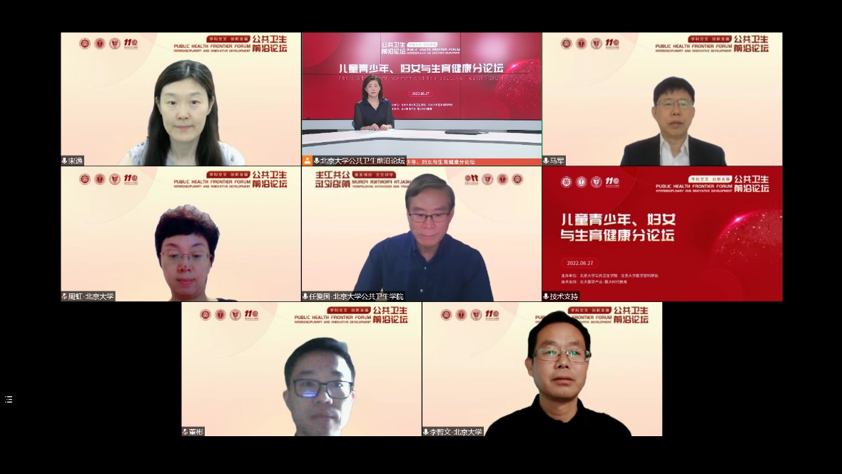 2022年正值北大医学办学110周年,北京大学公共卫生学院联合北京大学医学部科研处于8月26~27日共同举办了《“学科交叉,创新发展”公共卫生前沿论坛 》,旨在加强学术交流、促进公共卫生发展。作为公共卫生前沿论坛的重要部分,“儿童青少年、妇女与生育健康分论坛”于2022年8月27日(周六)8:30-17:30以线上和线下相结合的方式召开。本次分论坛的主题是“新时期儿童青少年、妇女与生育健康热点问题”,目的是邀请国内外相关领域专家学者围绕新时期国内外儿童青少年、妇女与生育健康领域面临的热点和前言问题进行广泛交流,促进北京大学儿少、妇幼与生育健康学科群建设,也为兄弟院校相关专业学科群的发展提供借鉴。分论坛分上、下午两个模块,上午是国内外资深专家专场,下午是青年学者专场。共邀请了18位国内外相关领域嘉宾进行了演讲,邀请了6位资深专家进点评。