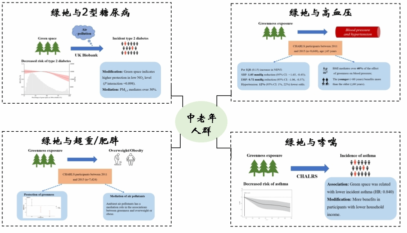 既往该研究团队基于我国健康与养老追踪调查(CHARLS)数据库,开展了绿地与中老年人群健康的系列研究,包括探讨了绿地水平与我国中老年人群血压水平和高血压患病、超重/肥胖风险以及哮喘发生之间的关联。研究结果显示: