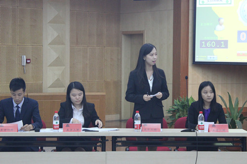 在开场双方队员的自我介绍环节,公卫队别出心裁,结合图片生动地介绍了团队的四位成员,他们分别是(下图由右至左)一辩赵艾,二辩刘璐,三辩张远(队长),四辩武骁飞。