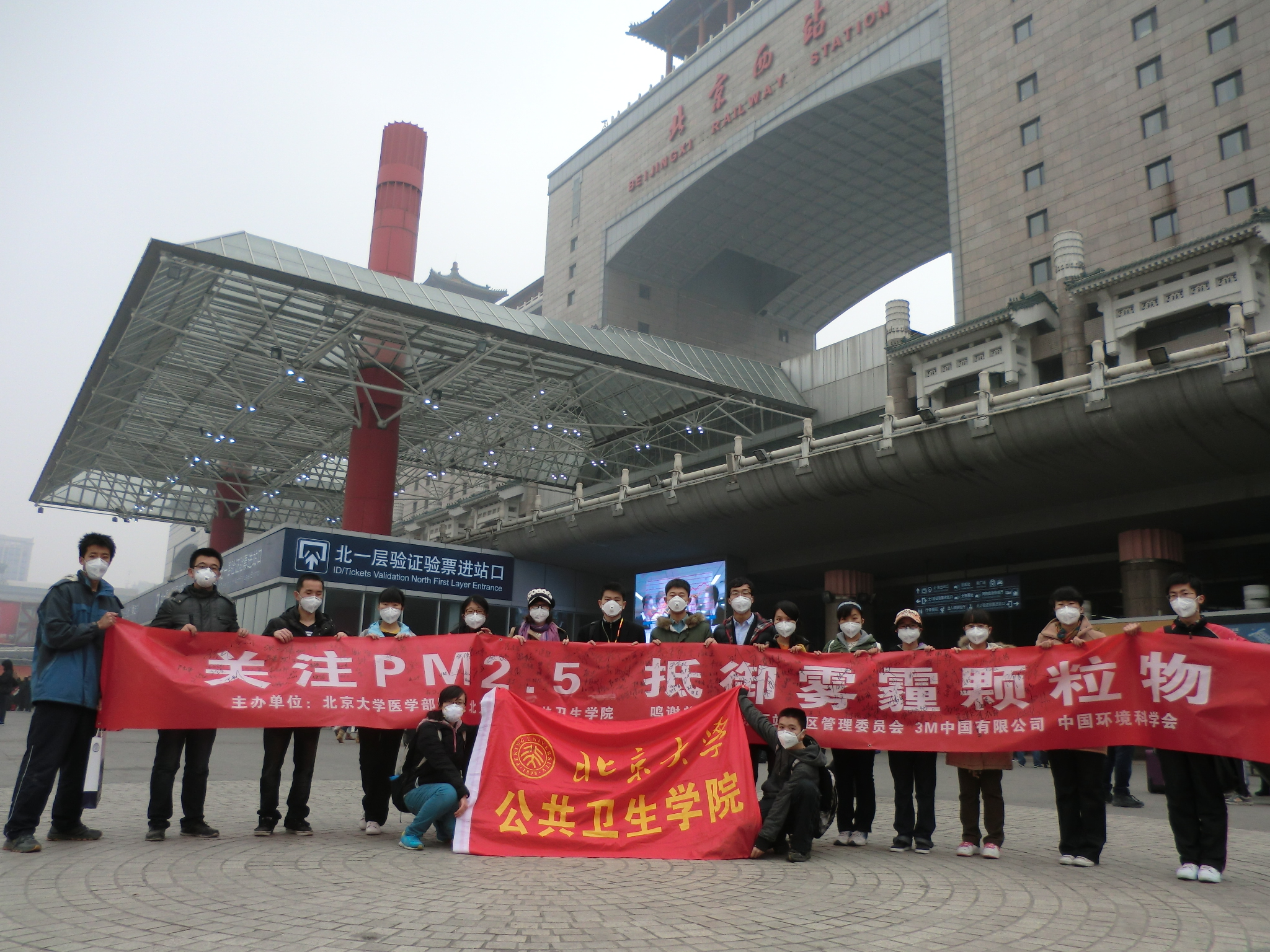 为科学引导大家关注环境健康问题,进一步普及PM2.5科普知识,让大家深入了解什么是PM2.5、PM2.5对人体的危害以及如何防护,同时践行公共卫生学院学生“公卫天下,天下为公”的理念,北京大学公共卫生学院学生会于2013年3月31日上午在北京西站举行了公卫文化节系列活动之“PM2.5 Protect Myself”的校外宣传活动。活动志愿者由公卫学院2011、2012级同学组成,3M中国有限公司的一名工程师也前来现场指导专业知识。此次活动得到3M中国有限公司、海淀区疾病预防控制中心以及北京西站地区管理委员会的大力支持。
